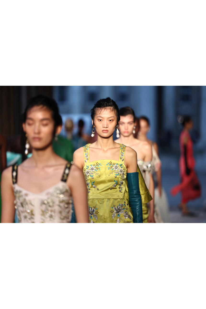 Les invités ont été transportés dans un monde onirique où les robes et les jupes à volants en tulle prenaient vie, créant une danse harmonieuse de formes et de couleurs. Les pièces maîtresses du défilé étaient indubitablement les œuvres artisanales mettant en scène des arbres de perles minutieusement élaborés à la main par des femmes de minorités chinoises, symbolisant un puissant arbre de vie.