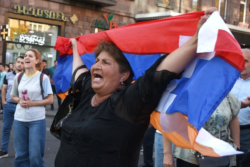 Les Arméniens ont manifesté en masse jeudi à Erevan. La capitulation du Karabakh a fait monter la pression sur le Premier ministre Nikol Pachinian, critiqué pour ne pas avoir aidé les Arméniens de l'enclave. (AFP)Le succès militaire des Azerbaïdjanais nourrit, en effet, les craintes d'un départ massif des 120.000 habitants de cette enclave.
