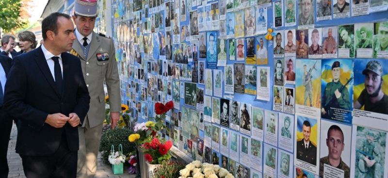 Le ministre français de la Défense Sébastien Lecornu devant le Mur de la mémoire des défenseurs ukrainiens tombés au combat lors de sa visite à Kiev le 28 septembre 2023. (AFP)