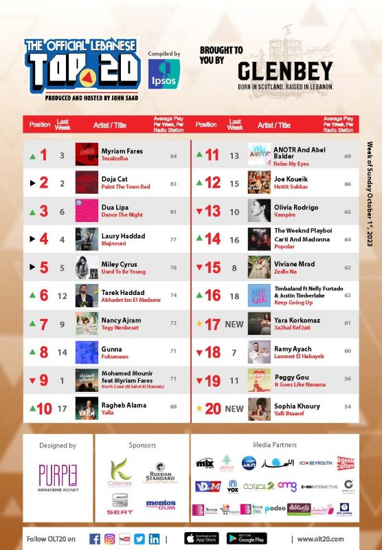Cette semaine dans OLT20, nous avons deux nouvelles entrées. La plus avancée, 3a2bal Ref2ati, est signée par la chanteuse libanaise Yara Korkomaz. Elle arrive en 17ᵉ place. Elle est suivie, en 20ᵉ place, de Yalli Btaaref, de la chanteuse libanaise Sophia Khoury qui signe son premier tube dans le Top.