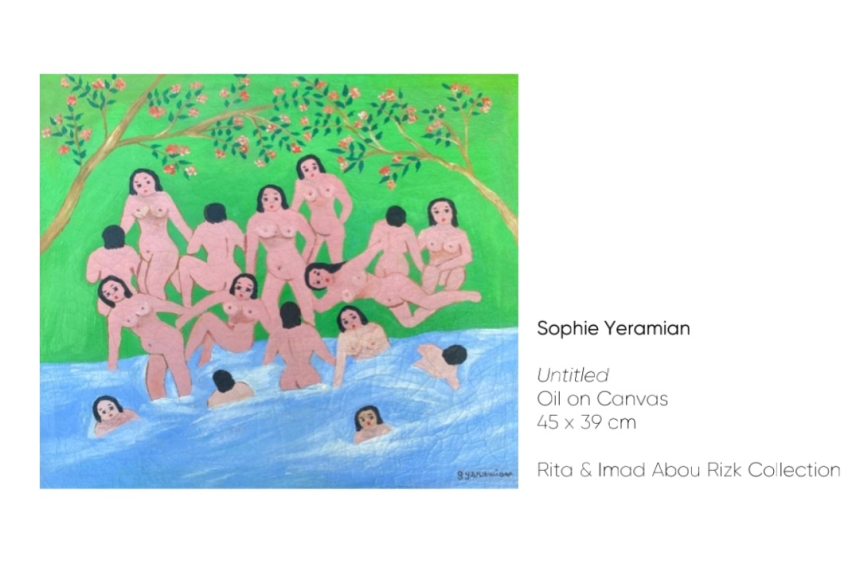 RS: L’idée était d’inscrire la génération moderne avec la génération émergente. Il ne faut pas oublier que les guerres et les crises sont perpétuelles dans notre pays et les archives presque inexistantes. Simon et moi sommes très ancrés dans la réalité institutionnelle. Notre but est de contextualiser et de démocratiser l’art. On a choisi des œuvres majeures iconiques modernes en se fondant sur les portfolios d’artistes émergentes qui nous sollicitent régulièrement. Au départ, il y avait déjà deux artistes représentées par Simon: Annie Kurkdjian et Shirine Kouwatly. On a contacté les autres artistes émergentes et on leur a demandé de produire une œuvre, donc une commande, représentant un lien avec leurs aïeules sans jamais écraser leur propre identité.