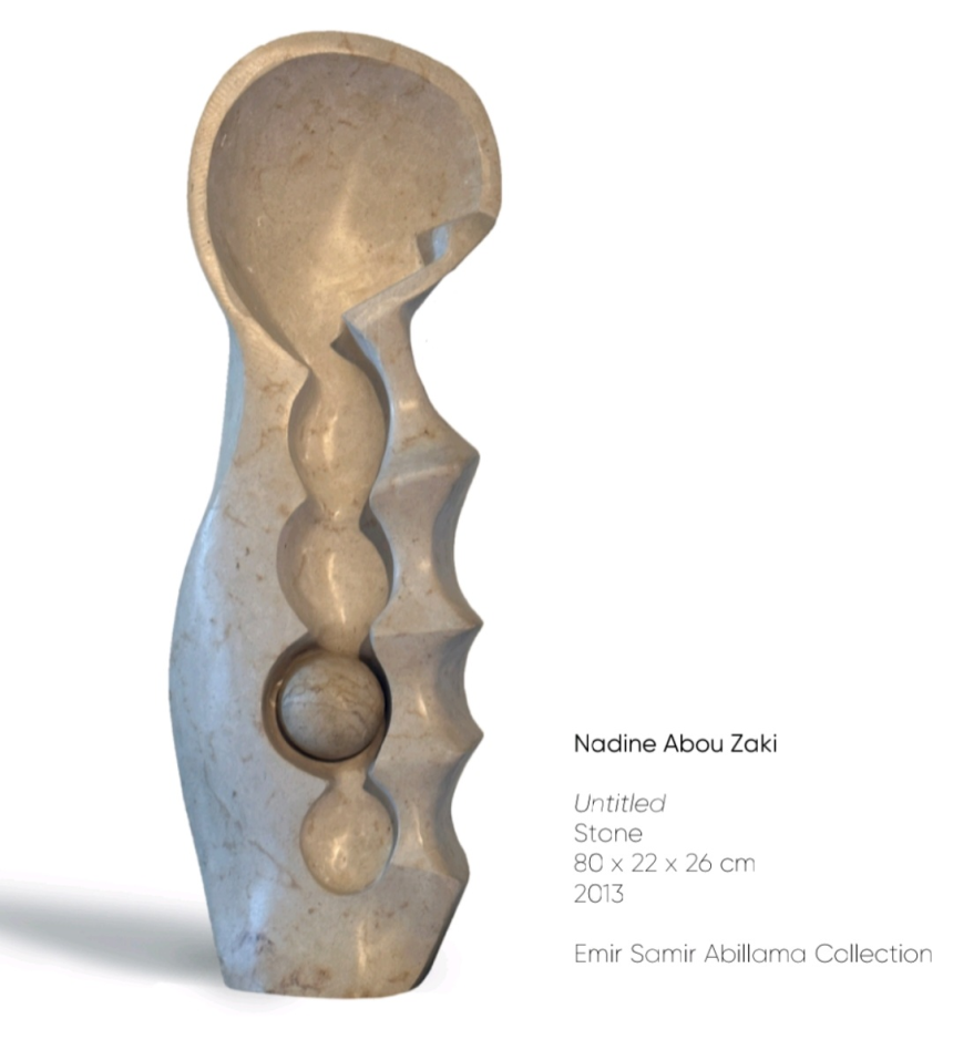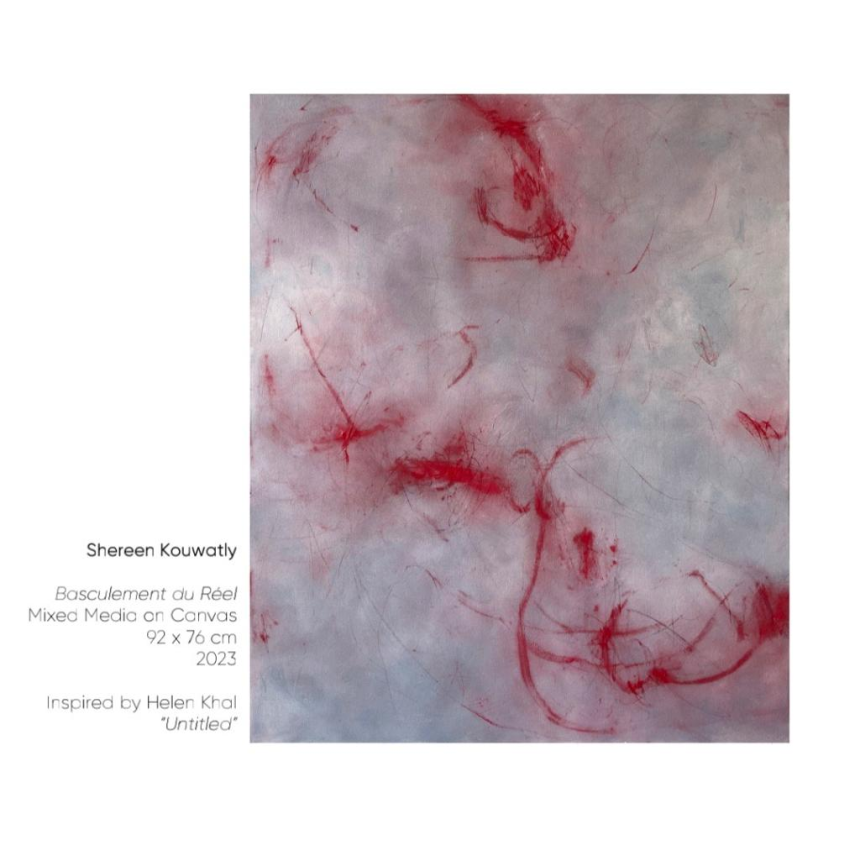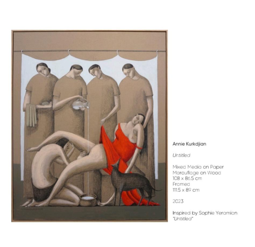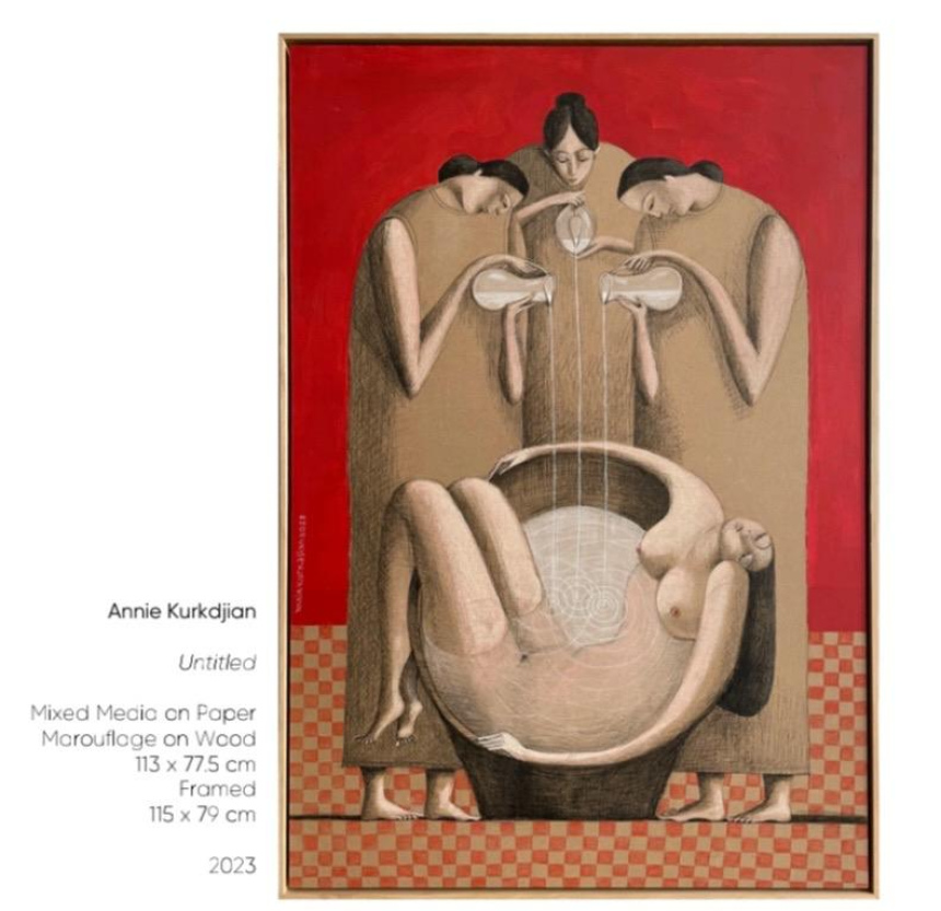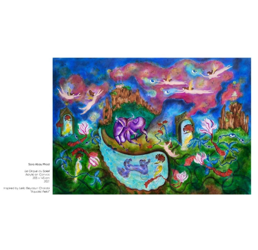 Sara Abou Mrad, inspirée dans cette exposition par Leila Beydoun Chalabi, est une artiste libanaise multidisciplinaire basée à Paris, diplômée de l’Institut des beaux-arts de l’Université libanaise. Elle est lauréate de plusieurs prix prestigieux dont le prix «Le Fonds Claude et France Lemand» (2020). Représentée par la galerie Claude Lemand depuis 2020, elle débute sa carrière professionnelle sur la scène artistique parisienne. Dans ses peintures, à travers son style surréaliste, Sara développe des sujets spirituels et existentiels en projetant ses expériences personnelles et intimes, ses désirs et ses espoirs. Son œuvre est un appel à préserver les valeurs humaines, la paix, la coexistence, l’amour, la foi, l’union et la solidarité. L’éloge de l’amour, de la beauté et du rêve restent le noyau de l’esthétique de l’art chez l’artiste. Elle attire l'attention sur les épreuves de l’automutilation, l’autosabotage, et au-delà, les intentions suicidaires que l’on traverse en silence. Dans ses corps déformés et démesurés, Sara souligne la souffrance du corps et celle de l’esprit dans la solitude et l’intimité. Torture, douleur, dépression et angoisse reflètent la vulnérabilité de l’Homme. Sara a participé à de nombreuses expositions individuelles et collectives, régionales et internationales, notamment à Paris, Zurich, Amsterdam, Londres, Koweït et Doha. Plusieurs de ses œuvres font partie de grandes collections privées et publiques, notamment la collection permanente du musée de l’Institut du monde arabe, le Fonds Claude et France Lemand et la Fondation Dalloul.