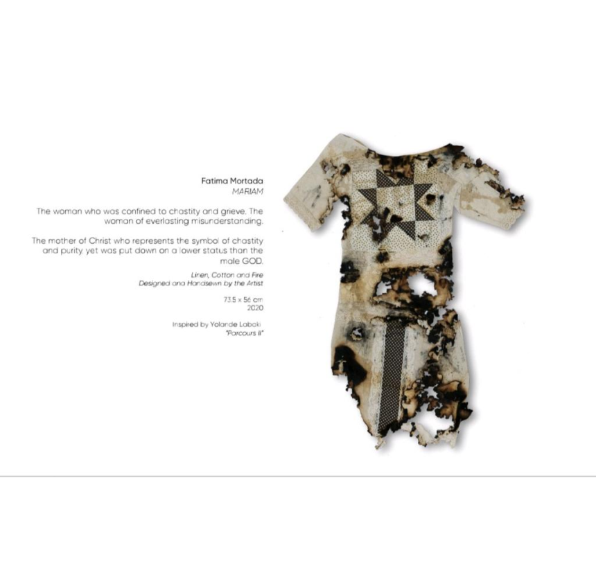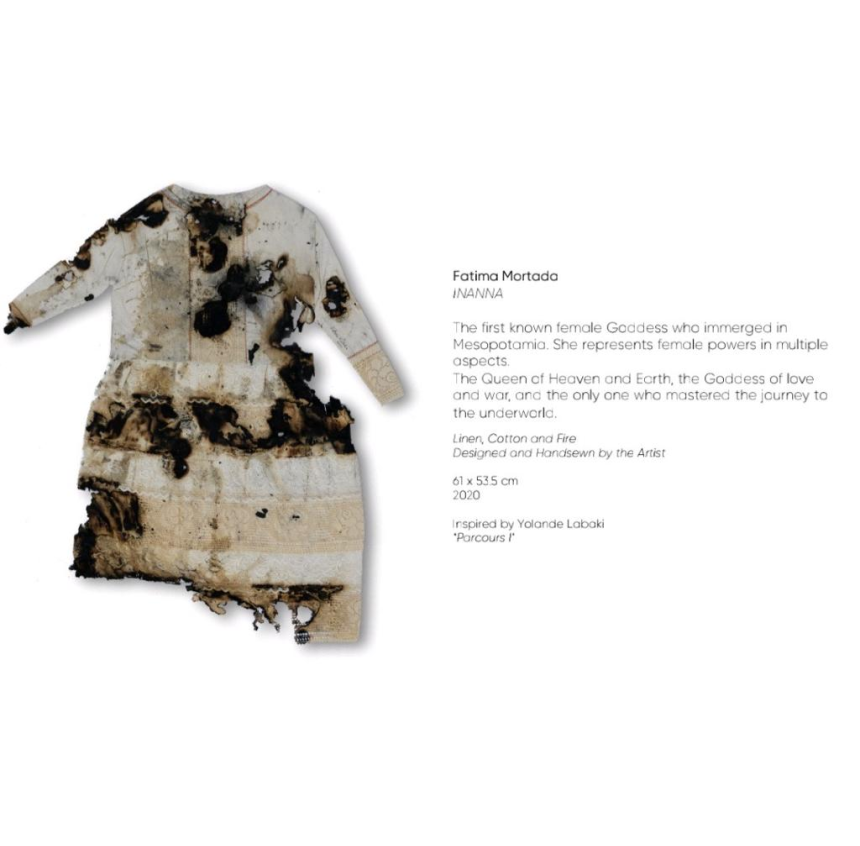 SM: Il y a aussi Fatmé Mortada qui a mené un travail de sept ans sur la femme dans les mythes et les religions. Elle a choisi neuf figures féminines qui n’ont pas été reconnues à leur juste valeur, dont Vénus, Inanna, Astarté et d’autres. Elle a réalisé une reproduction minutieuse en broderie, de leurs habits traditionnels, avec la même texture, les mêmes proportions et des brûlures voulues sciemment dans les tissus pour mettre en valeur leur dimension mutilée.