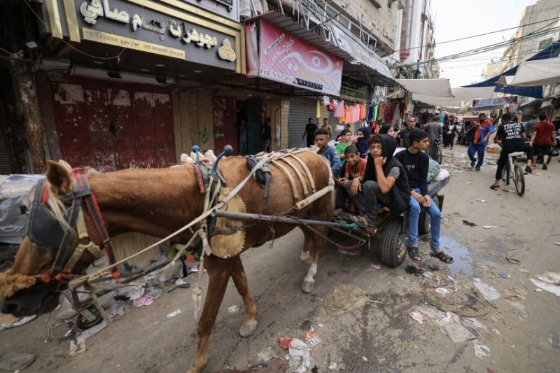 Les Palestiniens utilisent des charrettes tirées par des ânes pour se déplacer à Khan Yunis, dans le sud de la bande de Gaza, le 28 octobre 2023, en raison d'une pénurie de carburant pour les voitures dans le contexte des combats en cours entre Israël et le groupe palestinien Hamas. (Photo de Mahmud HAMS / AFP)Les opérations humanitaires et l'activité des hôpitaux "ne peuvent continuer sans communications", s'est alarmée Lynn Hastings, une responsable de l'ONU.