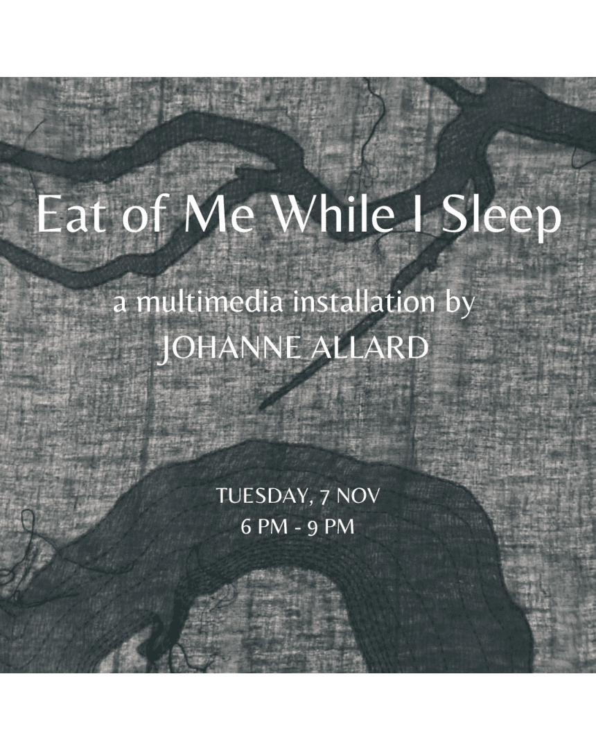 No/mad utopia a récemment annoncé l’exposition Eat of Me While I Sleep, une exposition inédite consacrée à l'installation multimédia de Johanne Allard, avec la collaboration de Jad Atoui pour la conception sonore et l'amplification. L'exposition se tiendra du 7 novembre au 9 décembre 2023, avec un vernissage le 7 novembre au soir, de 18h à 21h. L'exposition bénéficie du soutien du Conseil des arts du Canada.