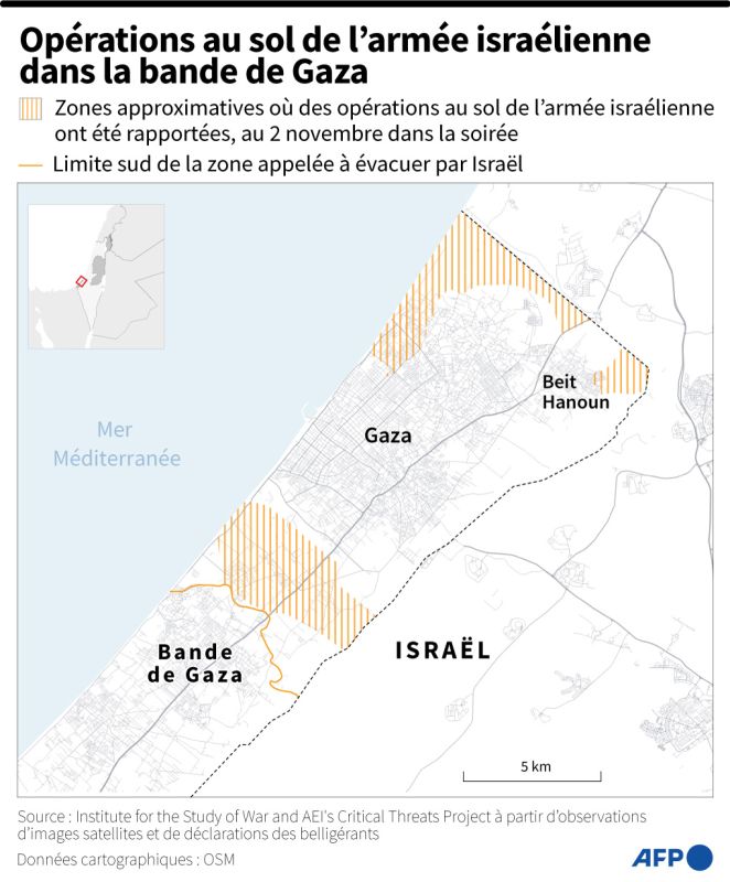Progression au sol des forces israéliennes en date du 3 novembre. (SIMON MALFATTO, AFP)