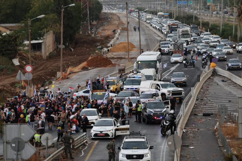 Des Israéliens défilent sur une autoroute depuis Tel Aviv en direction du Parlement israélien à Jérusalem pour demander la libération des otages (Photo de AHMAD GHARABLI/AFP)