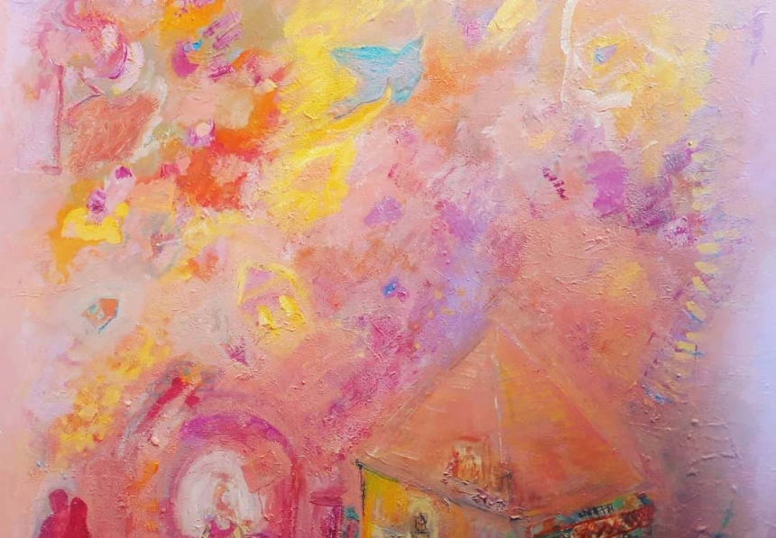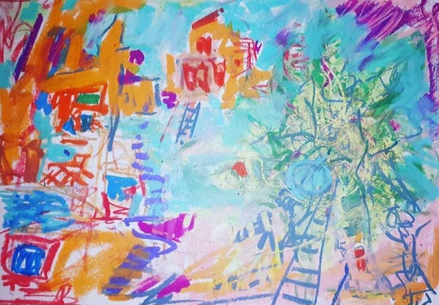Mais pour Joanna, les fées de son enfance sont ses parents, sa tante et sa téta (grand-mère) dans une cuisine au décor suranné qui rappelle, comme la madeleine de Proust, la bonne odeur des pains chauds et le chocolat aux doigts qu'on lèche avec gourmandise! Ses toiles laissent entrevoir à travers le voile des souvenirs cette échelle ou cet escalier qui permettait de rejoindre la tetkhité ou mezzanine prévue pour les provisions d'hiver, ou encore l'enfant sur sa table en train de faire ses devoirs, la maison ancienne à arcades, le vieux salon à tentures, le parfum usé du sac de grand-mère... Tous les éléments sont là pour pousser le spectateur à s'identifier à l'artiste, aller en quête de ce paradis perdu, fait de ces petits riens, bouquets d'innocence et d'éclats de rire dans une explosion d'allégresse et d'arcs-en-ciel!