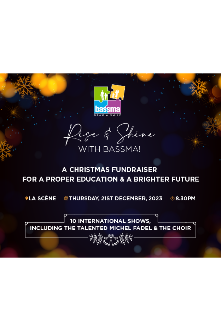 Bassma organise une soirée de collecte de fonds à l'approche de Noël, prévue le jeudi 21 décembre 2023. Cet événement se tiendra à 20h30 à La Scène, à Beyrouth, sous le thème évocateur: «Lève-toi et brille, une levée de fonds de Noël pour une bonne éducation et un avenir meilleur».