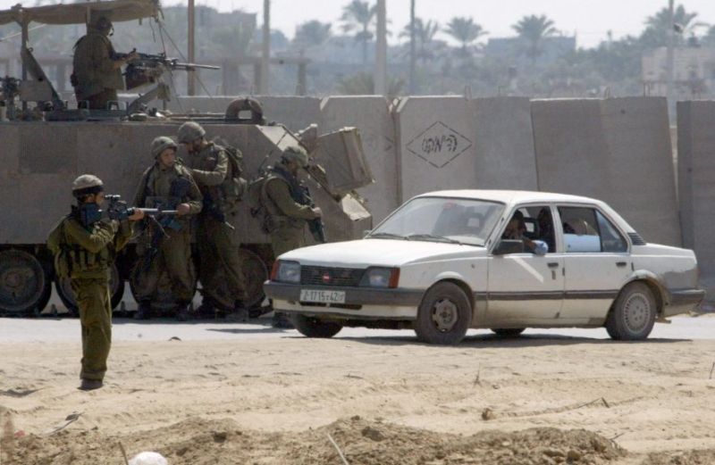 Un soldat israélien, prenant position sur la jonction principale menant au bloc de colonies juives de Gush Katif, pointe son arme sur une voiture palestinienne, le 8 octobre 2002, alors que l'armée israélienne a fermé la route principale entre le nord et le sud de la bande de Gaza et arrêté les voitures pour des contrôles de sécurité. (Fayez NURELDINE, AFP)Mais surtout, en 35 ans de colonisation, seuls 8.000 colons y ont établi leur foyer. Ils représentent 1% de la population de l’enclave. Un rapport démographique largement défavorable aux colons, qui rend caduques de telles installations à long terme.