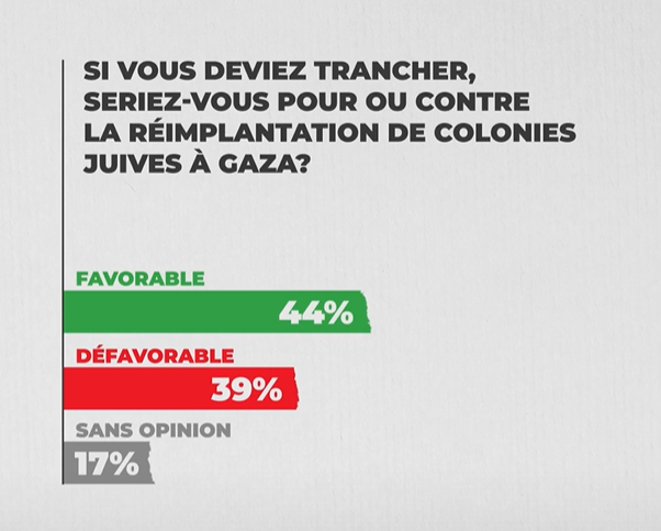 Source: Institut de sondage israélien Migdam.Selon un sondage publié le 15 novembre par l’institut de sondage Midgam, 44% des Israéliens seraient ainsi favorables à un retour des colonies juives à Gaza. À titre de comparaison, 39% seraient en défaveur.