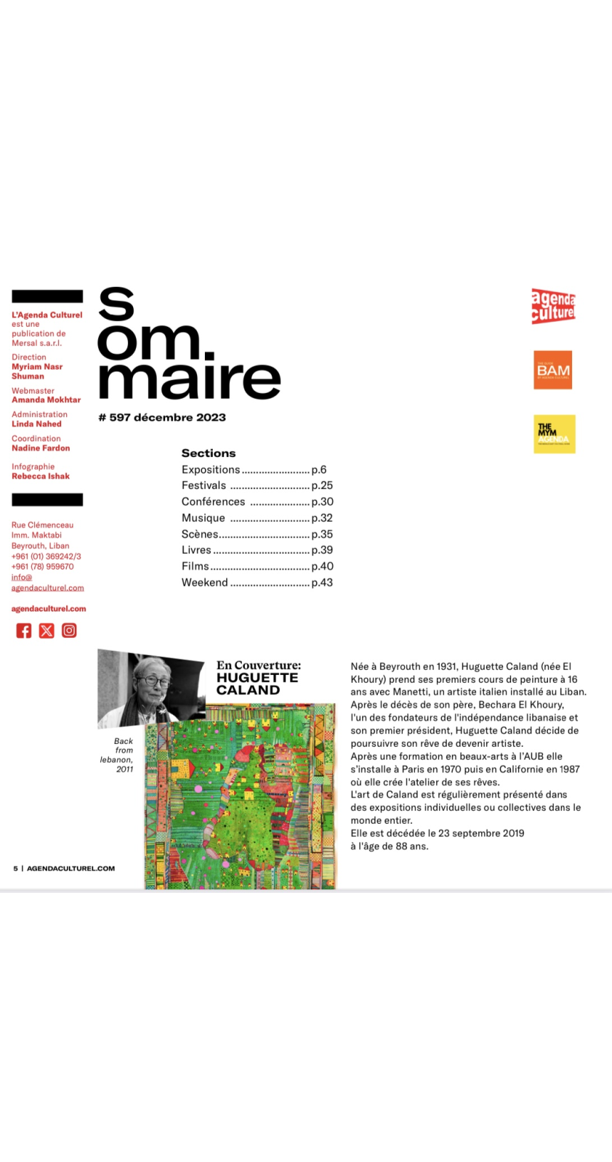 Myriam Nasr Shuman et son équipe remercient chaleureusement la Fondation R.A.M. et Monsieur Robert Matta pour leur soutien constant. Cette aide a été essentielle pour la reprise du magazine, permettant de «rassembler l’énergie nécessaire pour continuer notre activité, comme avant…»