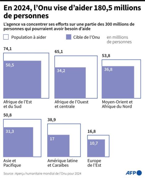 Graphique montrant le nombre de personnes que l'ONU prévoit d'aider dans six grandes régions du monde au regard des besoins estimés pour 2024 - AFP / Sylvie HussonLe responsable de l'aide des Nations unies, Martin Griffiths, a déclaré que le soutien nécessaire de la communauté internationale n'était pas à la hauteur des besoins, soulignant le rôle des humanitaires pour sauver des vies et faire face à diverses crises.