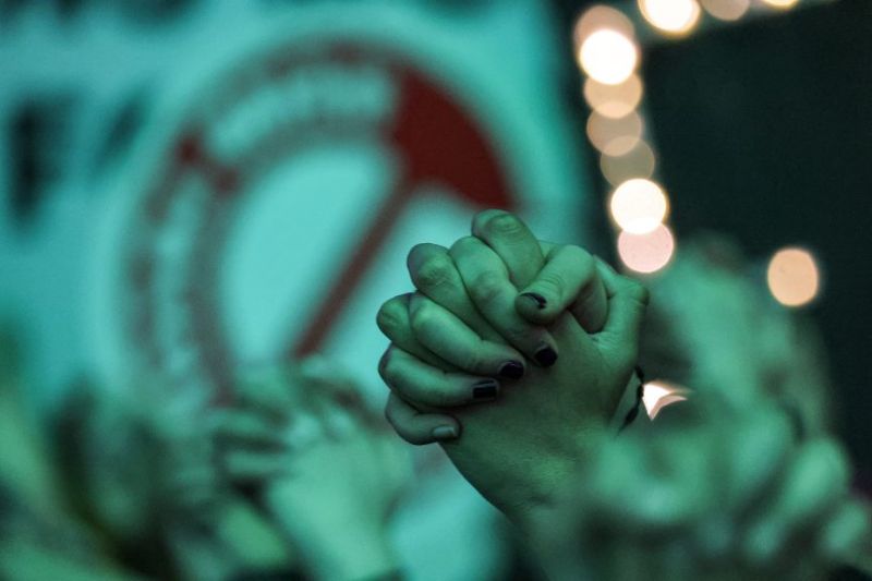 Des militants pour le climat se donnent la main lors d'une manifestation contre les combustibles fossiles pendant la Conférence des Nations Unies sur le changement climatique COP28 à Dubaï, le 12 décembre 2023. (Photo par Giuseppe CACACE / AFP)