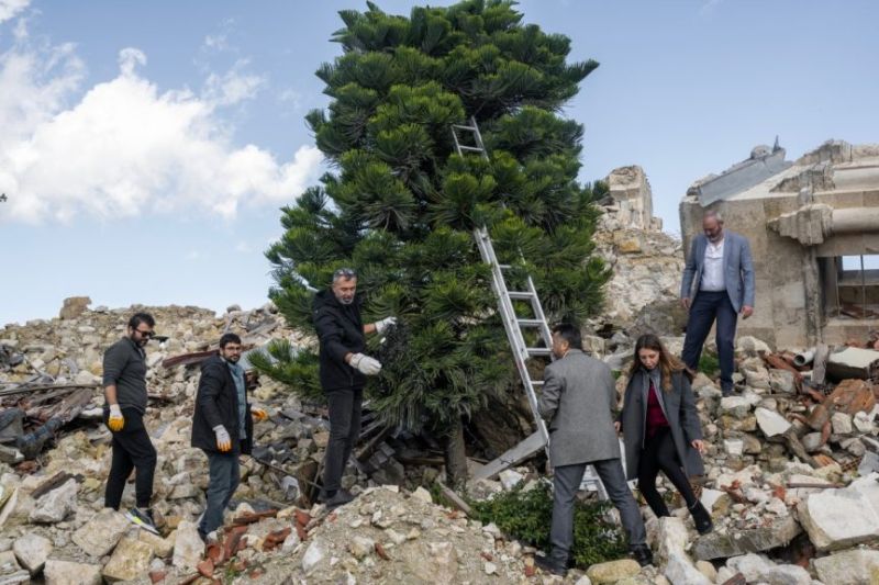Au sommet de l’éboulis de pierres blondes, le grand pin se dresse comme un miracle, unique vestige de l’église orthodoxe d’Antakya détruite par le violent séisme du 6 février qui a balayé le sud de la Turquie.