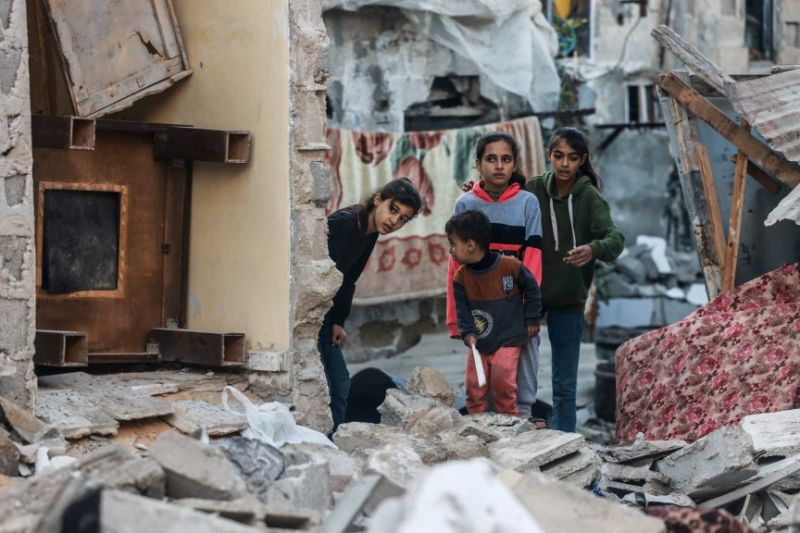Des enfants inspectent les dégâts causés par les bombardements israéliens à Rafah, dans le sud de la bande de Gaza, le 29 décembre 2023. (AFP)Ces derniers jours, outre les déplacés venus du nord et du centre du territoire, «au moins 100.000 personnes» ont rejoint Rafah du fait de l'intensification des opérations militaires israéliennes à Khan Younès (sud), selon l'OCHA.