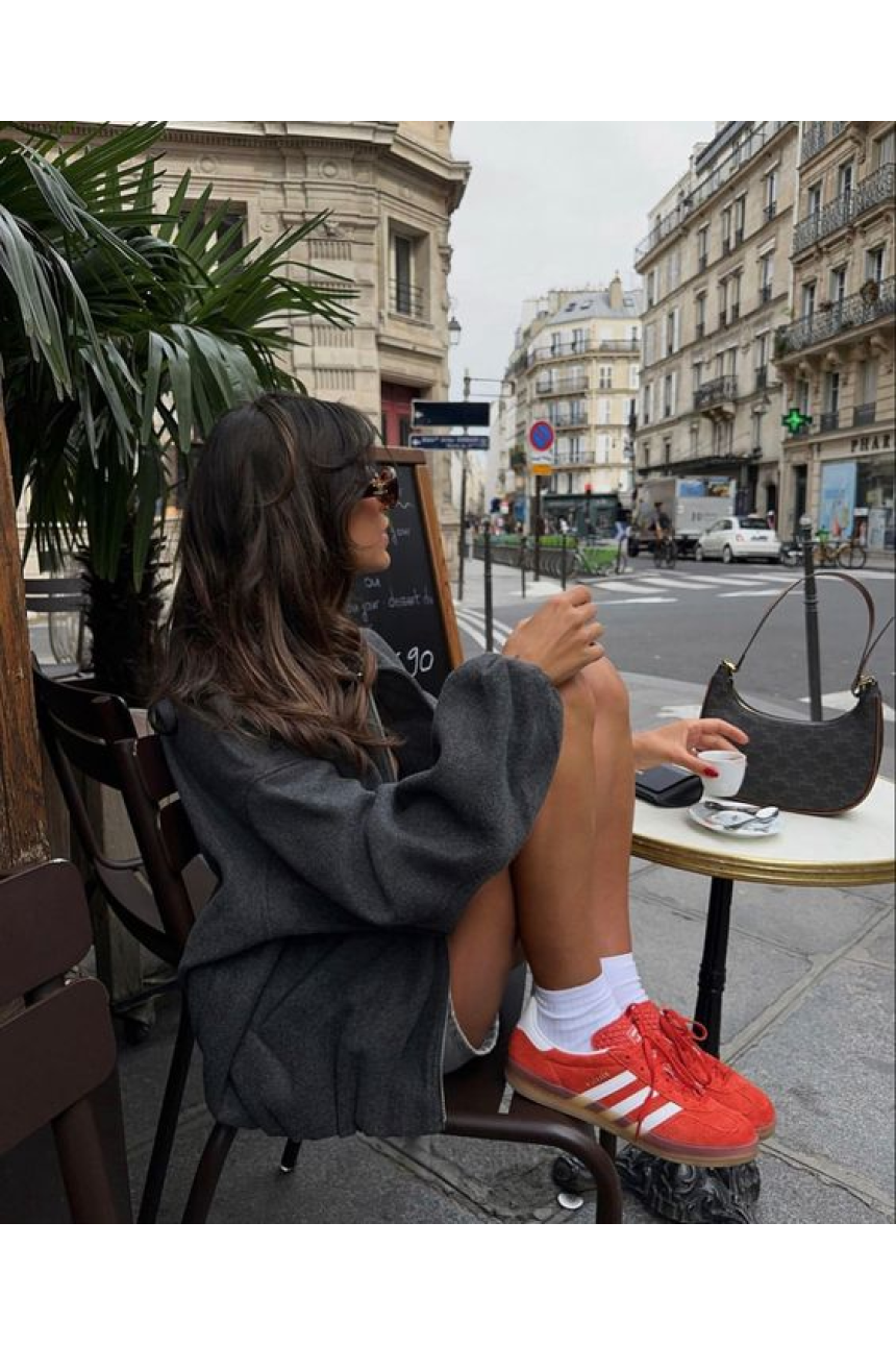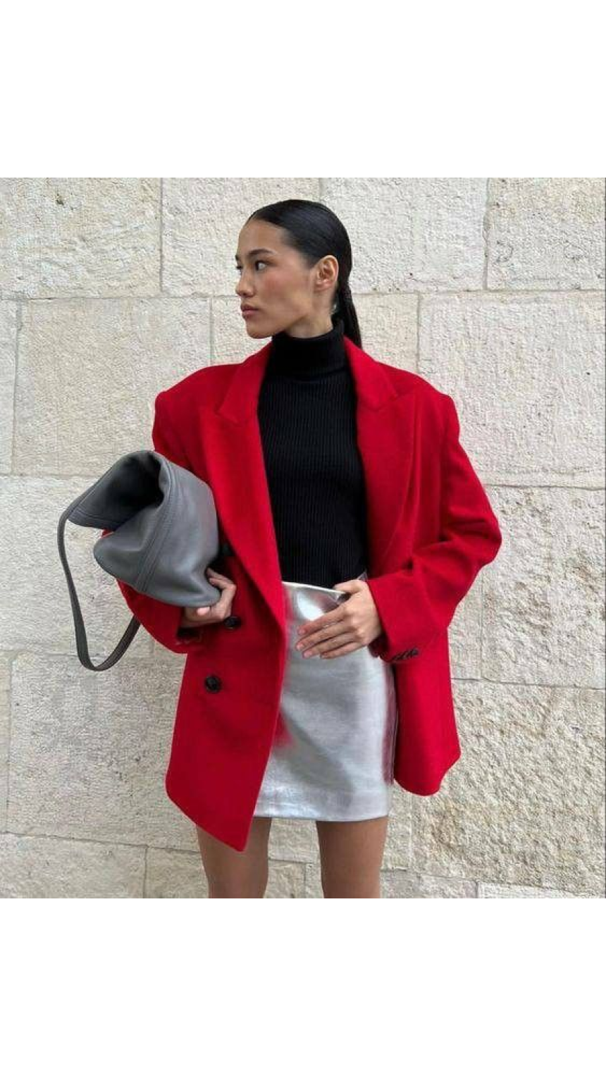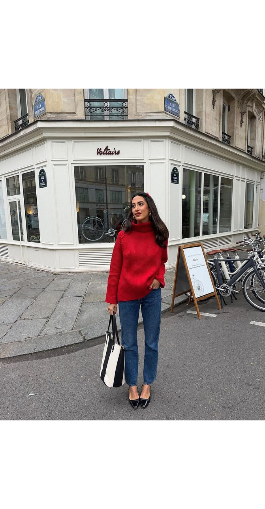 Pour une allure décontractée avec une pointe d’audace, mariez une grosse maille rouge avec un jean et des baskets blanches, glissant le tout sous un large manteau bleu marine. Ajoutez une touche tendance avec des boucles d’oreilles dorées imposantes.