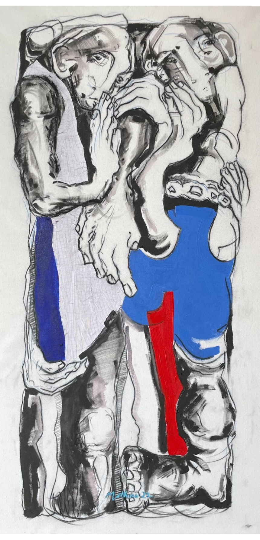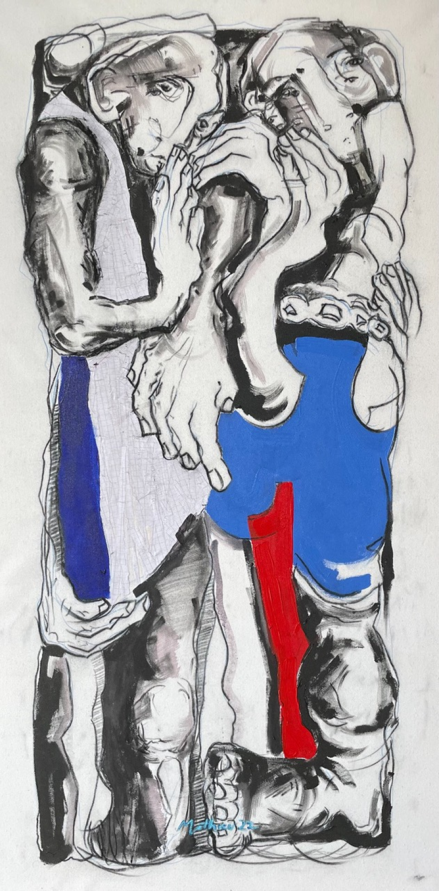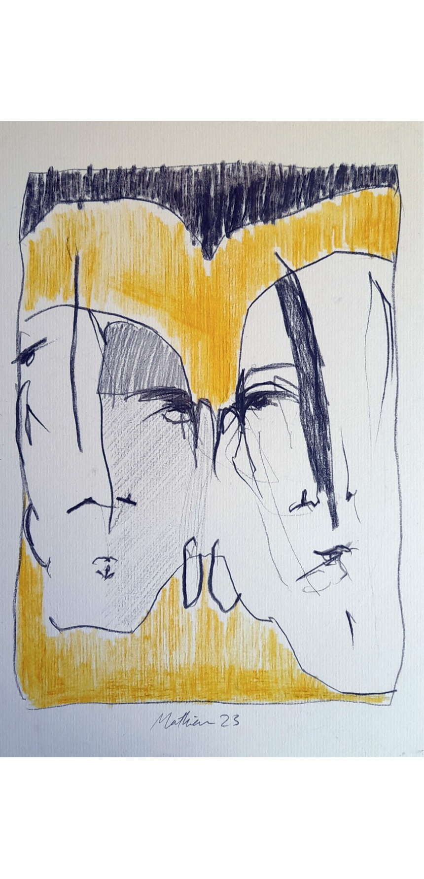 C’est en griffonnant des personnages sur ses papiers que Mathieu réalise qu’il les emprisonne dans le cadre de son œuvre, et il écrit ainsi sa nouvelle exposition. À force d’aimer fort, on emprisonne l’autre. C’est ce qu’il fait à travers ses 38 tableaux exposés chez Cheriff Tabet pour le bonheur de tous.