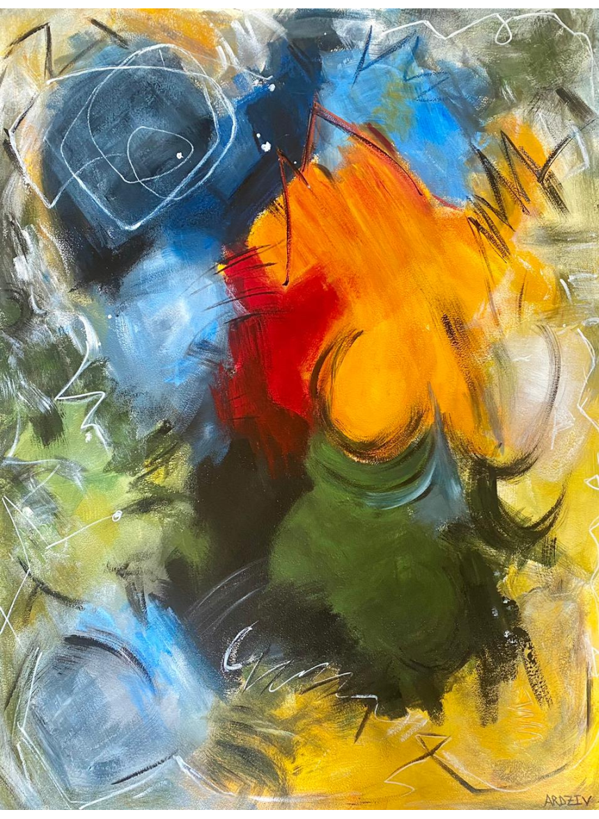 C’est un univers très personnel, mais extrêmement passionnel qu’Ardziv met en peinture. Elle est cet aigle agile et rapide qui prend son envol pour faire couler son art avec la puissance de ses pattes/pinceaux. Elle plane au-dessus de ses proies, comme la couleur qui coule de son âme pour faire luire les violents mélanges rouge orangé.