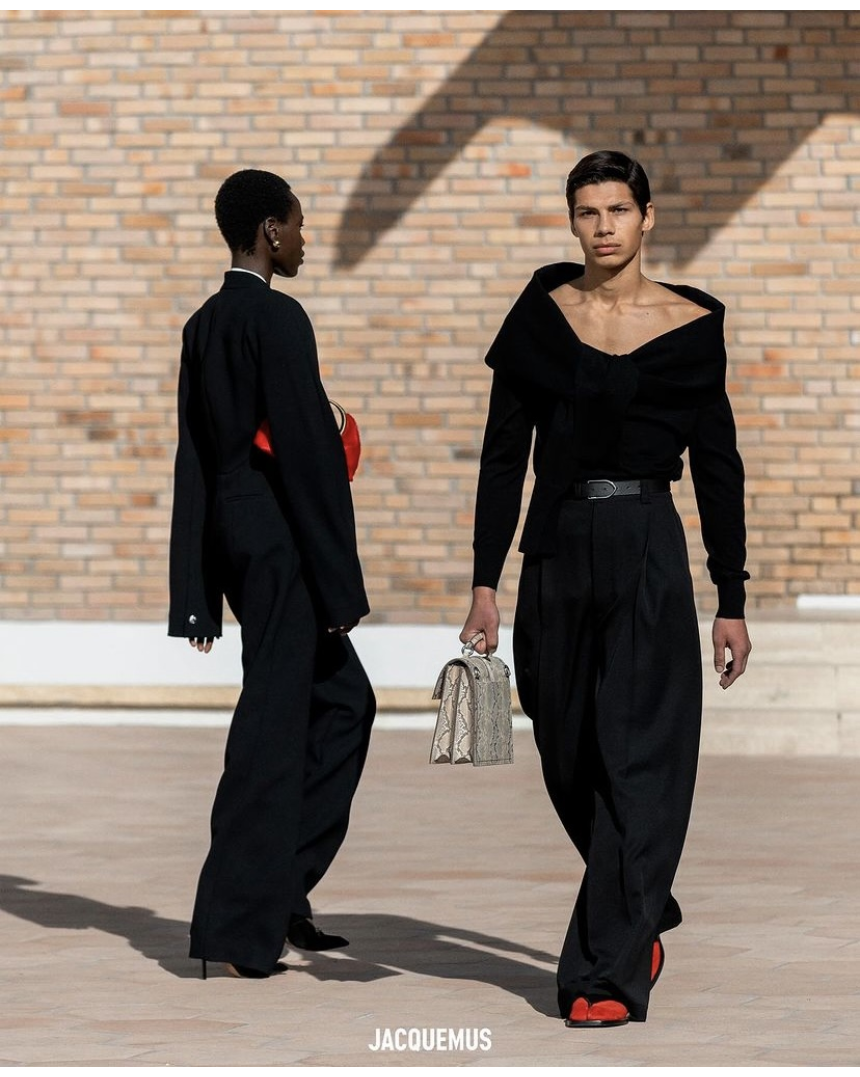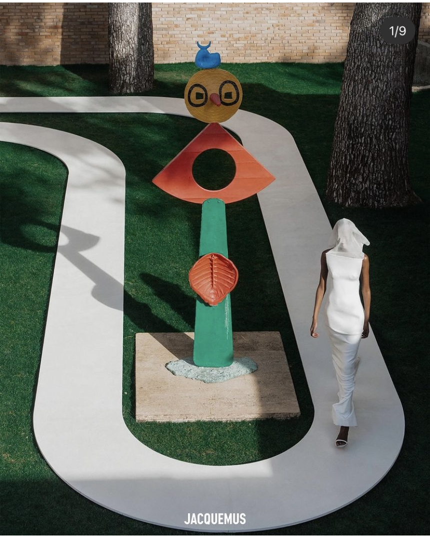 C’est avec cet esprit de fusion entre l’art et la mode que Simon Porte Jacquemus a choisi de présenter sa collection. Il explique son choix en disant: «Je savais qu’un jour je ferais un show ici, car pour moi c’est l’art de vivre, le sens de l’humour, les portes ouvertes, la poésie, la famille…»