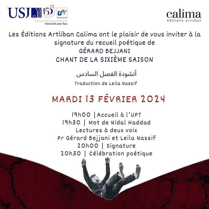Lors d'une soirée qui promet d'être empreinte de lyrisme et d'émotion, l'Université pour tous s'apprête à accueillir Gérard Bejjani, professeur-chercheur de littérature à l’université Saint-Joseph et titulaire de la Chaire Senghor de la francophonie de Beyrouth. Critique acclamé, romancier et poète de renom, Bejjani présentera son dernier recueil de poèmes, Chant de la sixième saison, publié aux Éditions Artliban Calima à l’Université pour tous, le 13 février 2024.