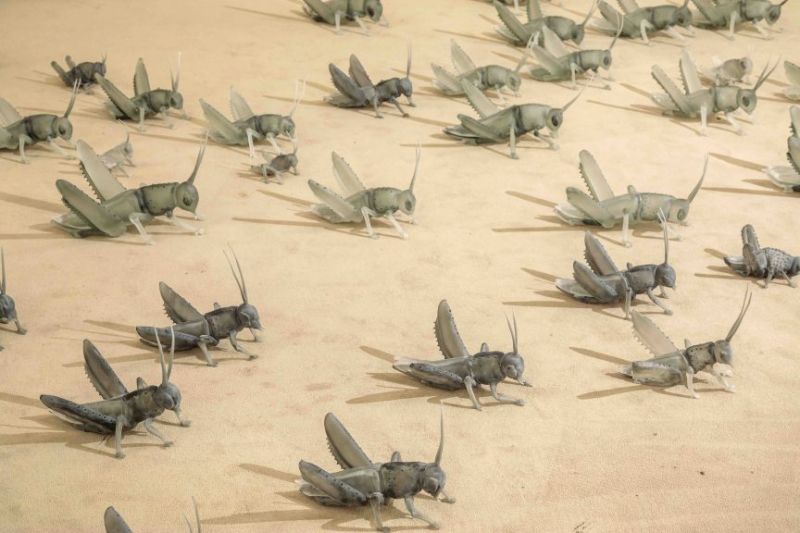 First Act, œuvre à forte valence mystique, n’en demeure pas moins surréelle, à travers la mise en scène d’un monde lumineux où les forces du bien provenant d’un au-delà indéchiffrable et inédit, l’emportent sur les forces du mal, symbolisées par une armée de locustes rampants et étincelants, réalisés en verre soufflé. Pour illustrer le thème de l’événement, l’énergie renouvelable, Marya a généré un monde neuf en s’inspirant du symbole immuable de la nativité. Un syncrétisme de croyances millénaires est opéré, qui aboutit à un credo renouvelé, la foi en un monde futur lavé de ses scories. La scène qui s’offre à l’observateur réussit le tour de force d’imposer un univers à la fois insolite et bienveillant. Les créatures géantes, cousues en tissu blanc immaculé, qui symbolisent les rois mages, portent à leurs extrémités des éoliennes. Le gage le plus précieux pour le monde à venir serait ainsi la puissance du vent, souffle d’air pur qui balayerait l’espace contaminé et s’opposerait aux effets de la consommation forcenée représentée par les locustes, plaie biblique par excellence, verre soufflé tétanisé par le souffle pur des géants blancs. La verticalité des mages domine le territoire des insectes rampants. Le doux toucher harmonieux évoqué par le tissu des personnages annule la menace des créatures rigides en cristal gris. Un monde ouaté, incontaminé, qui n’est pas sans rappeler la blancheur et les profondeurs insondables du continent arctique, triomphe sur la noirceur et l’impureté.