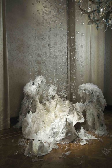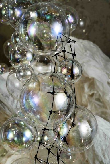 Where He Came From, installation performance (2009) est l’une des premières œuvres qui s’inscrit dans le projet Glasstress qu’Adriano Berengo a fondé en hommage à l’art de Murano, conviant les artistes contemporains de toutes disciplines, sculpteurs, peintres ou musiciens à collaborer avec les maîtres verriers de l’île. Lancé en 2009, faisant partie intégrante de la Biennale de Venise, c’est aujourd’hui l’un des événements majeurs alliant artisanat et créativité, visant à renouveler l’art du cristal de Murano à travers la contamination et le soutien de l’art contemporain. Des bulles en cristal voguent au-dessus de l’installation Where He Came From, reliées par des fils invisibles. Plastique, acrylique, mouchoirs en papier ont été employés pour reconstruire un paysage aux pics immaculés parsemé de lacs alpins. Déjà en 2009, dans The Mountains, Marya Kazoun avait dénoncé dans des toiles les effroyables atteintes portées à la nature par les changements climatiques.