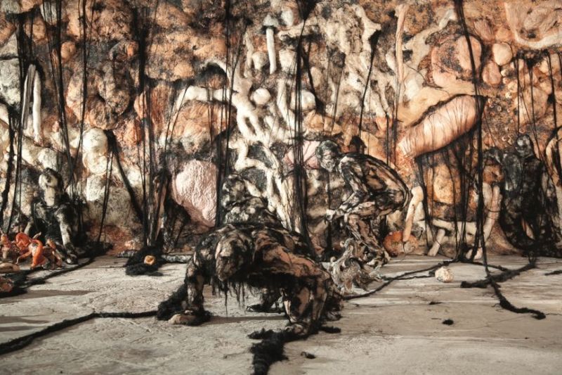 Le voyage à rebours à travers les œuvres de l’artiste est saisissant. Des installations, performances, tableaux ou sculptures aux thèmes surréels, rien n’est indigne de l’œuvre, des os de carcasses d’animaux, aux tissus disparates, mouchoirs, sacs en plastique dépecés ou autres débris de verre. Ce qui semblerait de prime abord irrécupérable est patiemment et génialement assemblé en un patchwork digne d’un modèle de haute couture, produisant des tissages, voire des échafaudages inouïs. Épeire tissant sa toile avec dévotion, l’artiste peut choisir de s’y fondre, dans un effet de mimétisme parfait, ou d’y inclure habilement d’autres personnages humains prệtant leurs corps à l’œuvre pour l’animer. Cette dernière offre alors un monde parallèle régi par des lois oniriques. La toile plutôt que de piéger les proies semble plutôt y capturer les rệves d’un monde dont nul ne serait exclu, métaphore d’un univers embrassant l’humanité dans sa totalité.