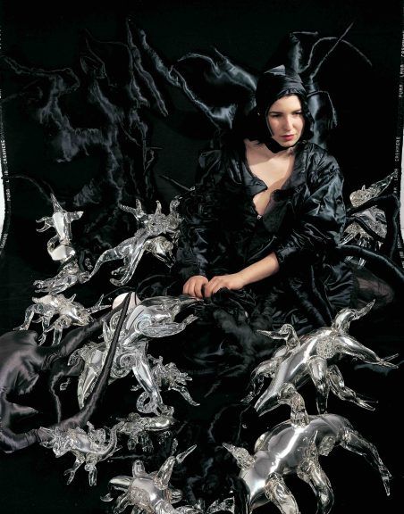 Que de chemin parcouru depuis l’installation-performance Ignorant Skin (2005) où des créatures, Amos, se détachent d’un mur tissé de fils, perles en verre et bambou pour s’y réfugier à nouveau, incapables de composer avec la hideuse réalité. Self-portrait (2003) met en scène les facettes «dark» de l’auteure, somptueusement parée d’un habit de sa propre création qui n’est pas sans rappeler le designer Alexander Mac Queen à ses heures de plus libre expressivité, entourée de «self-portraits», créatures à la nature incertaine en verre soufflé irisé de matière argentée. Dans Steady Breath (2005), l’artiste est à nouveau une protagoniste «gothique» de son installation aux spirales tissées qui rappellent indéniablement les sculptures de Calder.