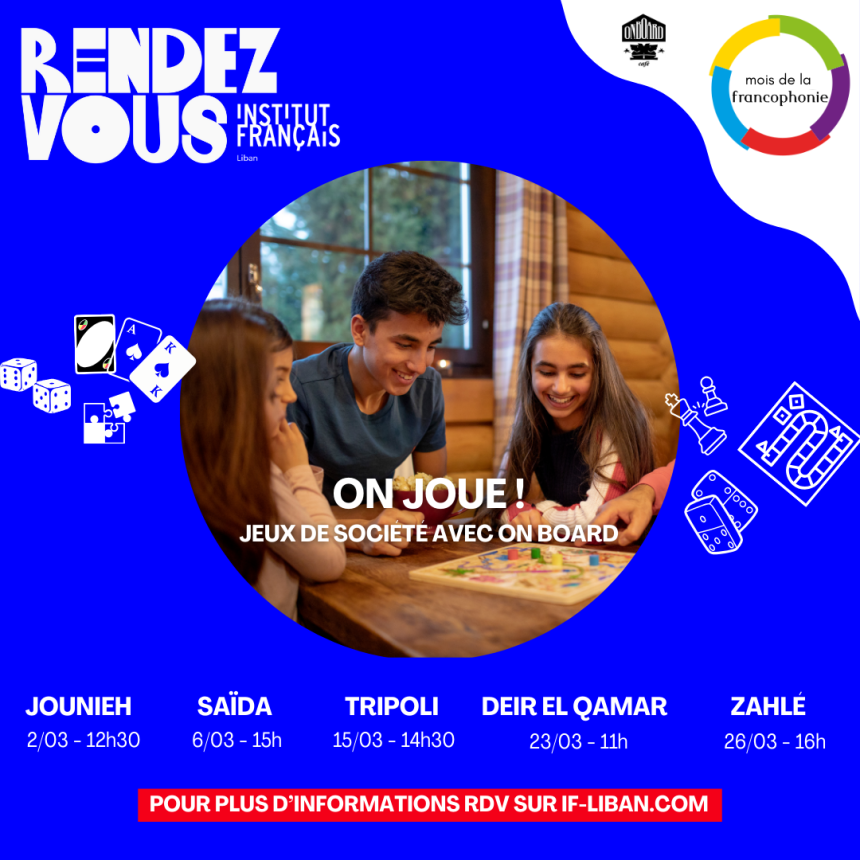 - Ateliers de jeux de société avec la tournée «On Board», faisant escale à Tripoli, Zahlé, Jounieh, Deir el-Qamar et Saïda.