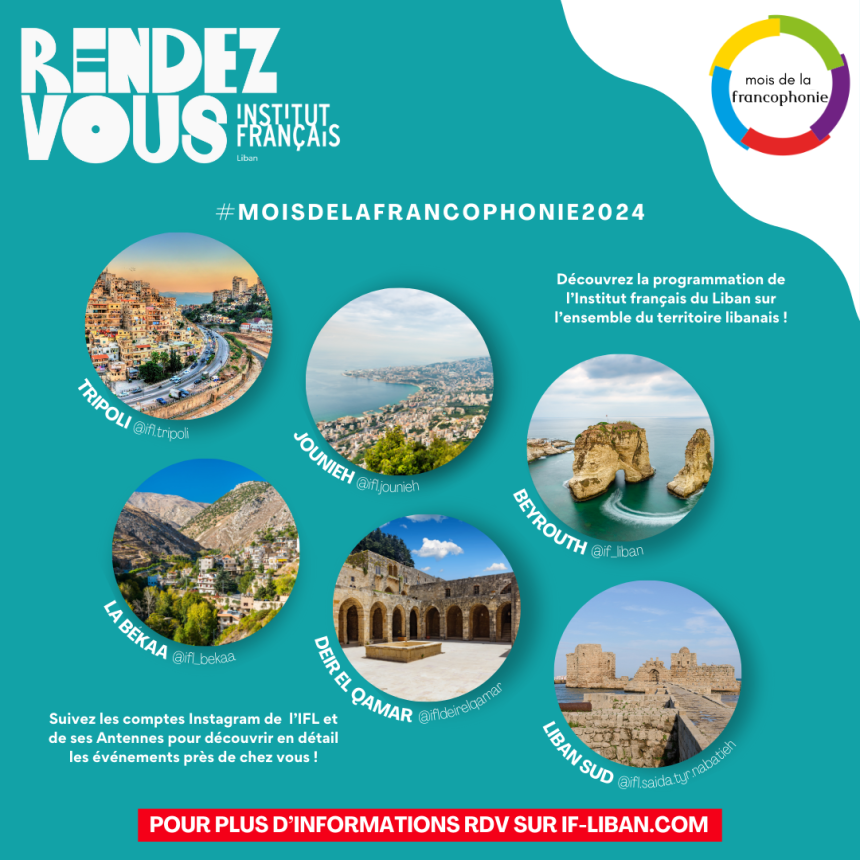 Chaque année, le mois de mars célèbre la francophonie dans sa diversité à travers le monde. À l'Institut français du Liban, le Mois de la francophonie se déclinera cette année autour du «vivant». Au rythme des performances artistiques, séances de dédicaces d'auteurs, ateliers pour enfants, projections, concerts, expositions et concours en ligne, plus d'une quarantaine d'événements seront organisés à Beyrouth ainsi que sur l’ensemble du territoire libanais à travers les antennes à Jounieh, Tripoli, Saïda, Deir el-Qamar, Baalbeck et Zahlé.