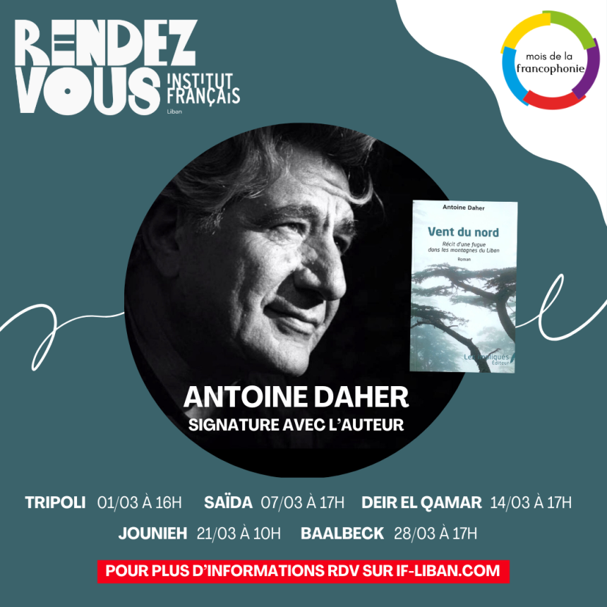 - Rencontre-signature avec Antoine Daher autour de son roman Vent du Nord, récit d’une fugue dans les montagnes du Liban.