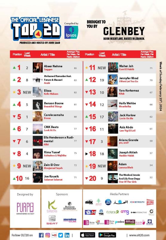 Cette semaine, dans OLT20, on a quatre nouvelles entrées. La plus avancée, Kello Waham, est signée Elissa et arrive en troisième place. Elle est suivie, en 9ᵉ place, par Moujarrad Sayeh, du chanteur libanais Zein El Omr, qui signe là son grand retour, et, en 11ᵉ place, par Esmi el-Habib, du chanteur libanais Maher Jah. Par ailleurs, le DJ et producteur musical libanais CMK Beats progresse vers le Top 5. Il se retrouve en 6ᵉ place avec Look at us.