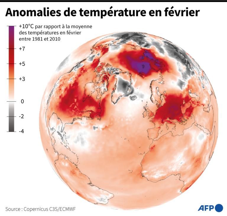 Carte du monde montrant les anomalies de température enregistrées en février 2024 par rapport à la moyenne des températures entre 1981 et 2010, selon l’observatoire européen Copernicus . AFP