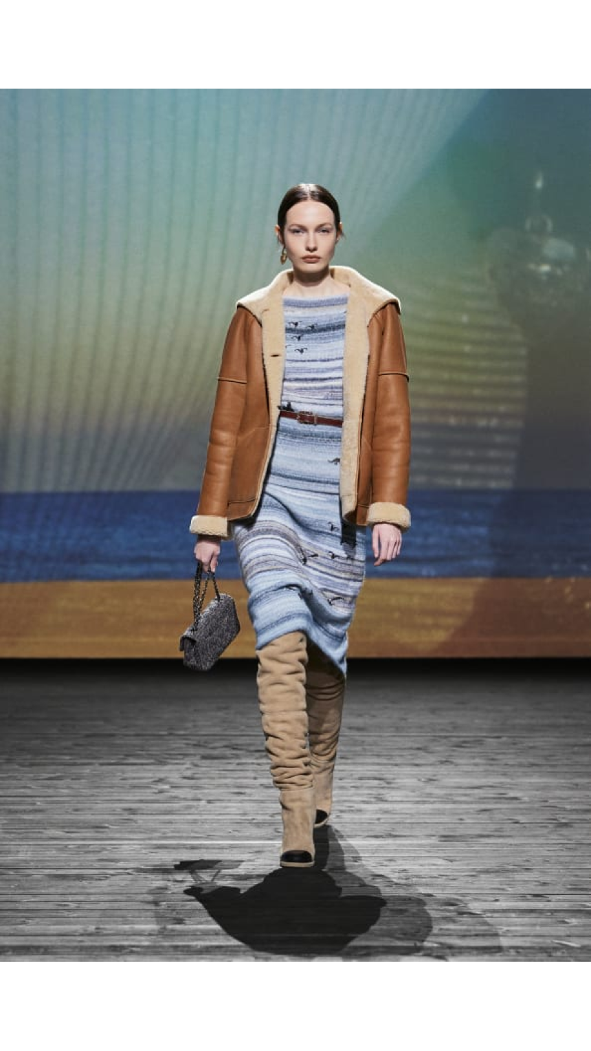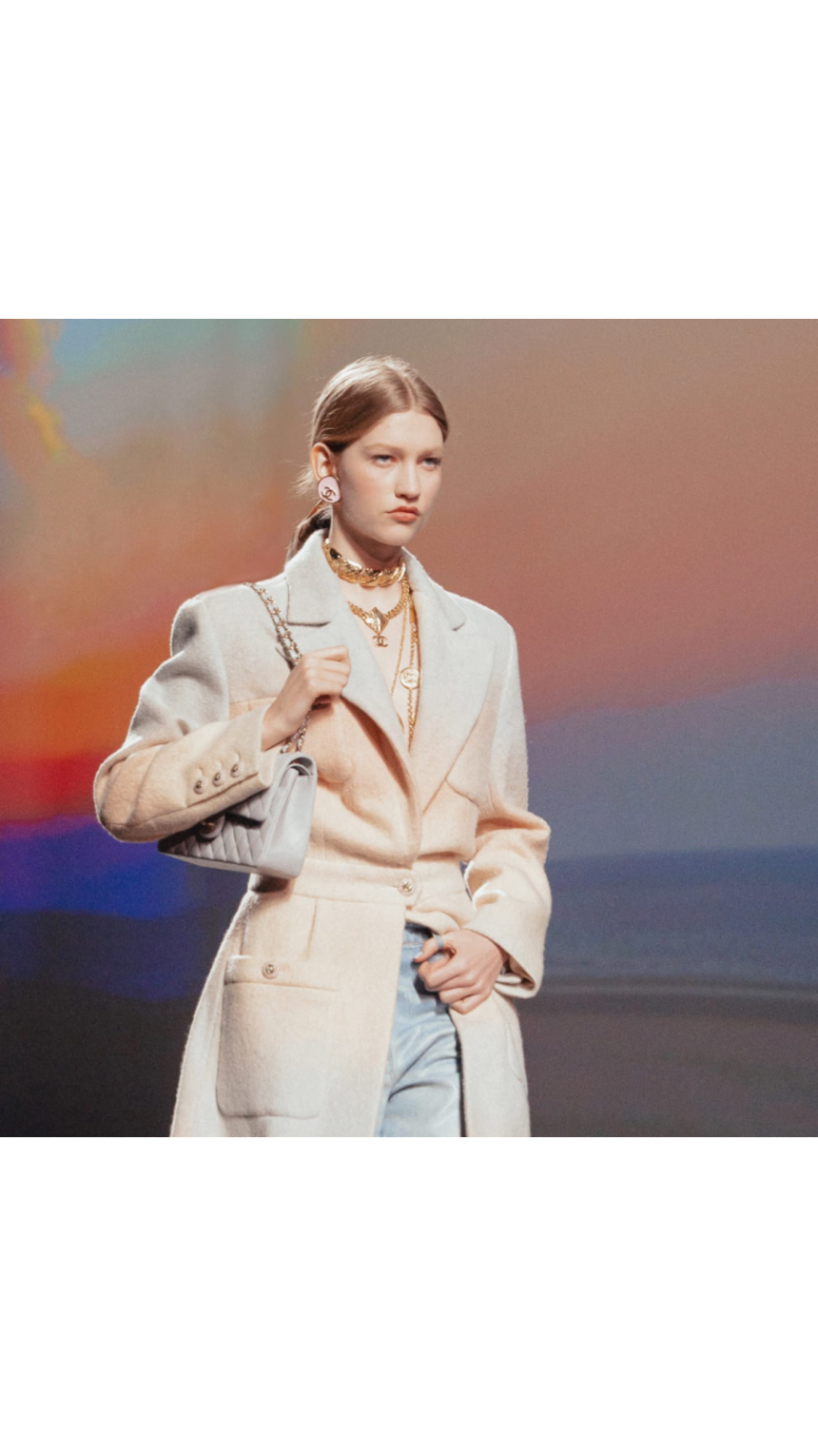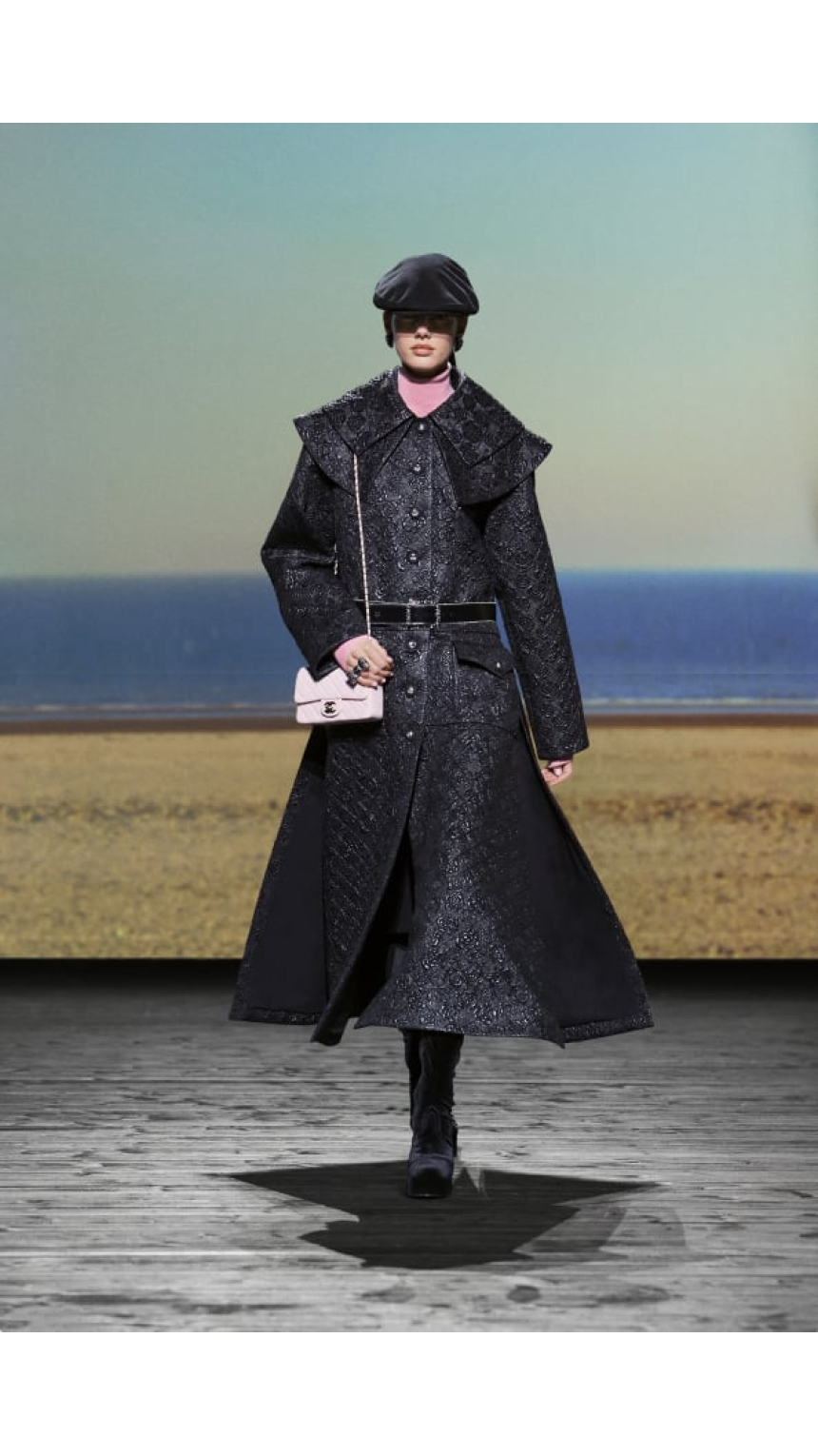 Au centre de la salle, un immense écran donnait vie aux Planches de Deauville, où l’on pouvait apercevoir de longues silhouettes romantiques se promenant de l’aube jusqu’au crépuscule. Ce décor grandiose a permis une immersion totale dans l’univers de la station balnéaire, rappelant l’attachement profond de Gabrielle Chanel pour cette ville. Comme elle le disait si bien, «c’est à Deauville que tout a commencé». C’est en effet dans sa boutique de la rue Gontaut Biron qu’elle proposa, dès 1912, une garde-robe inspirée de l’esprit marin, avec des matières comme le jersey, des tops et des tenues de marin. Cette collection Automne/Hiver 2024-2025, conçue comme une valise idéale pour une escapade à Deauville, perpétue avec brio cet héritage.
