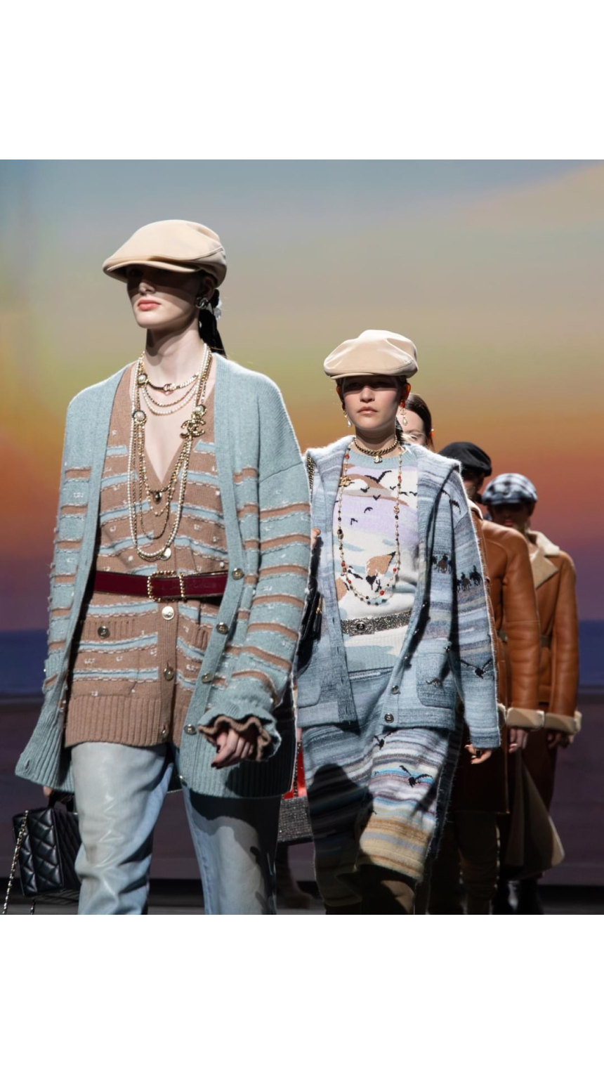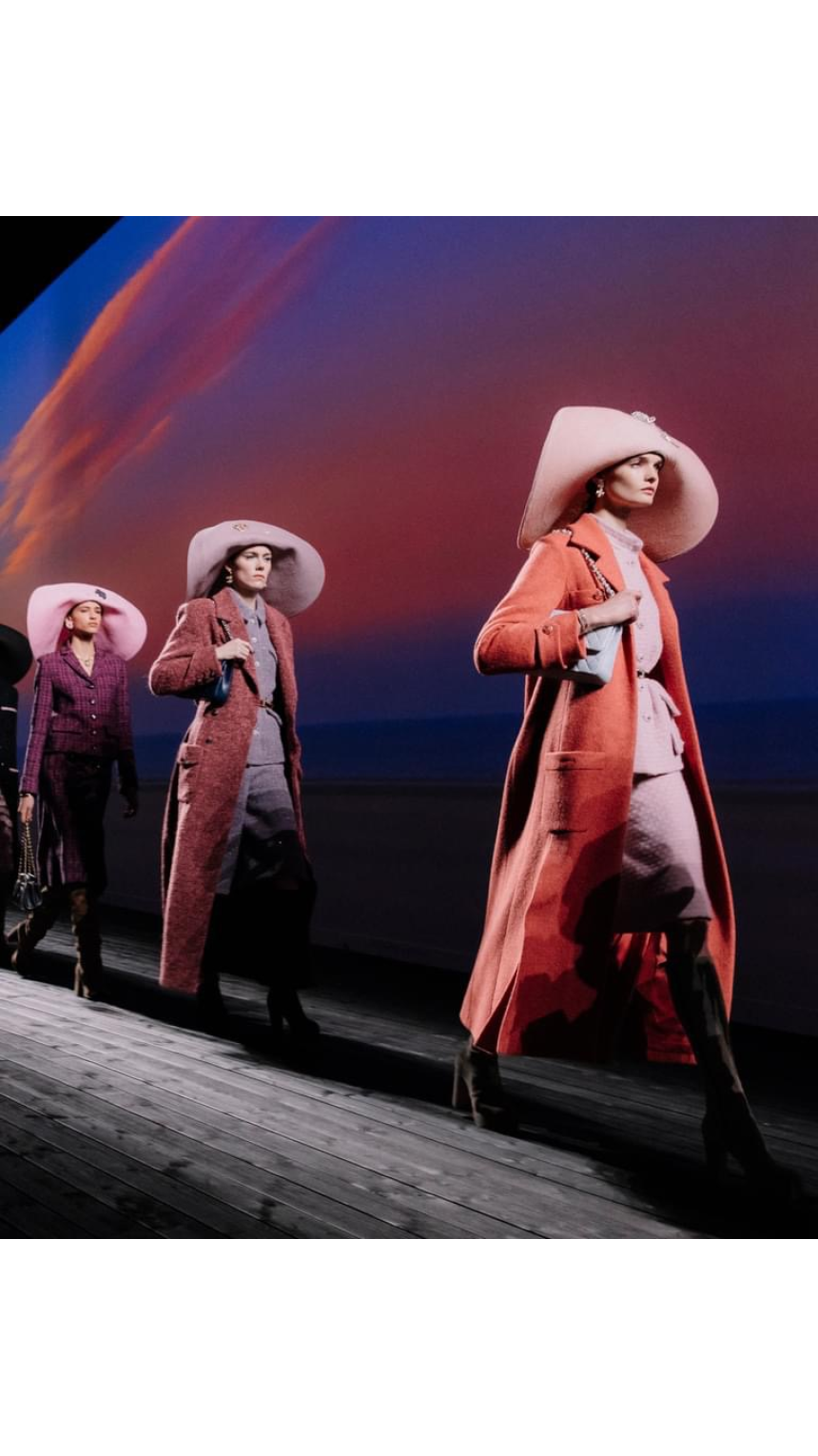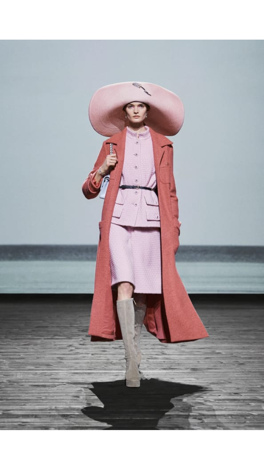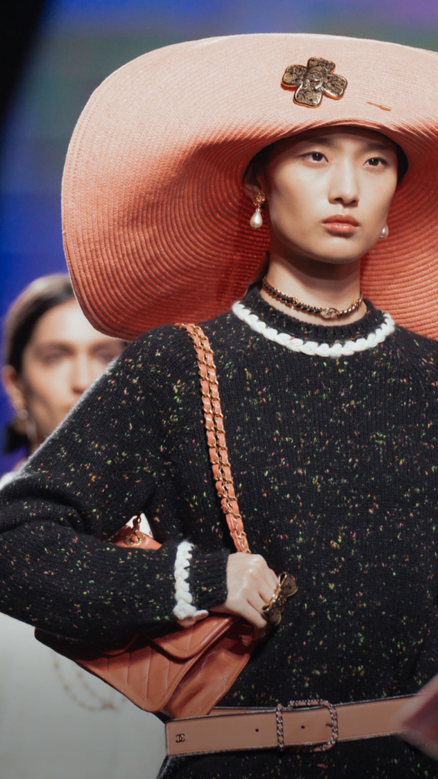 Pièce maîtresse de chaque silhouette, le chapeau aux larges bords et aux couleurs pastel, parfois orné d’un camélia étincelant ou d’un logo serti de pierres précieuses, fait directement écho à ceux que Gabrielle Chanel vendait dans sa boutique deauvillaise. La créatrice avait compris très tôt l’élégance intemporelle de cet accessoire, comme en témoigne cette citation: «Avec quatre yards de tissu et un chapeau, je peux me rendre n’importe où.»
