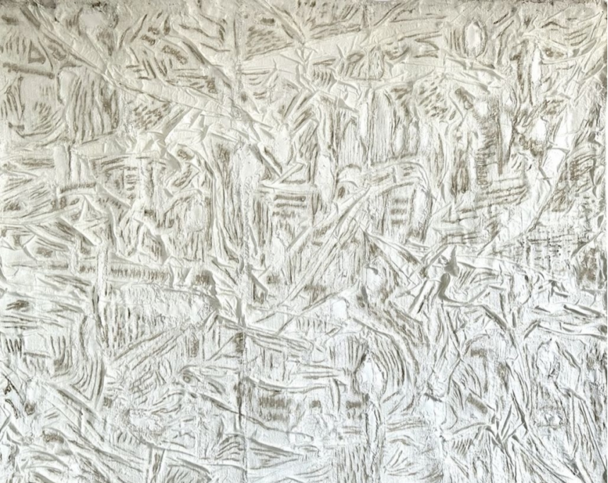 Dans sa toile intitulée Ballet de rides, il nous incite à entrer dans la danse de la résilience, à puiser au plus profond de nous-mêmes, afin d'y retrouver l'élan vital et l'énergie créatrice. La toile blanche de l'artiste ouvre ainsi une nouvelle page, afin d'opérer la métamorphose propice à la reconstruction et à la renaissance. Elle nous convie à transformer griffures et rides en plume rédemptrice, afin de réécrire l'histoire à la manière d'une œuvre d'art.