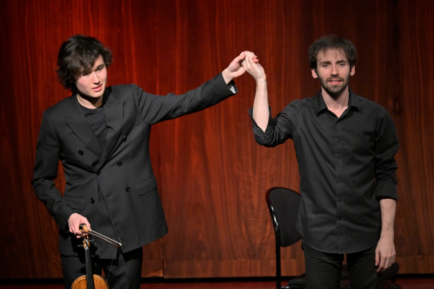 Alors que le programme préalablement annoncé par le festival incluait la Sonate pour violon et piano CD 148 de Claude Debussy (1862-1918), le duo clôt la soirée avec le Scherzo de la Sonate F-A-E, composée conjointement par Robert Schumann, Johannes Brahms (1833-1897) et Albert Hermann Dietrich (1829-1908). Toutefois, le Scherzo, aux couleurs beethovéniennes, a bien été écrit par Brahms. On peine à exprimer l'interprétation du jeune duo, sinon en affirmant qu'il ne s'agit pas d’une simple interprétation, mais plutôt d'une révélation de l'ineffable. Grandiose. Sous un tonnerre d’applaudissements, les musiciens gratifient leur public de deux bis: le nostalgique Liebeslied (Chagrin d’amour) de Fritz Kreisler (1875-1962) et un arrangement (non indispensable) des Feuilles mortes, une musique composée à la base par Joseph Kosma (1905-1969).