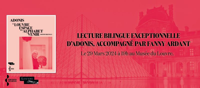 Le 29 mars 2024, l’auditorium du Louvre vibrera au rythme des mots d’Adonis, immense poète de notre temps. À ses côtés, Fanny Ardant, actrice légendaire et amoureuse des lettres, fera entendre en français les vers du recueil Le Louvre, espace de l’alphabet à venir. Publié ce mois-ci aux éditions Seghers/Louvre, ce recueil marque une étape importante dans l’œuvre du poète, qui pour la première fois consacre un ouvrage entier à un musée.