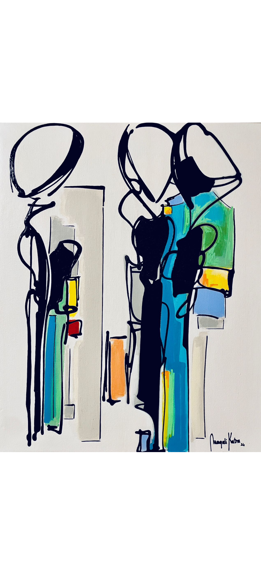 Magali Katra aborde également le thème de la solitude. Dans l’une de ses toiles, elle représente un personnage esseulé rejoignant un groupe, illustrant ainsi sa conviction que le partage génère davantage de bonheur.