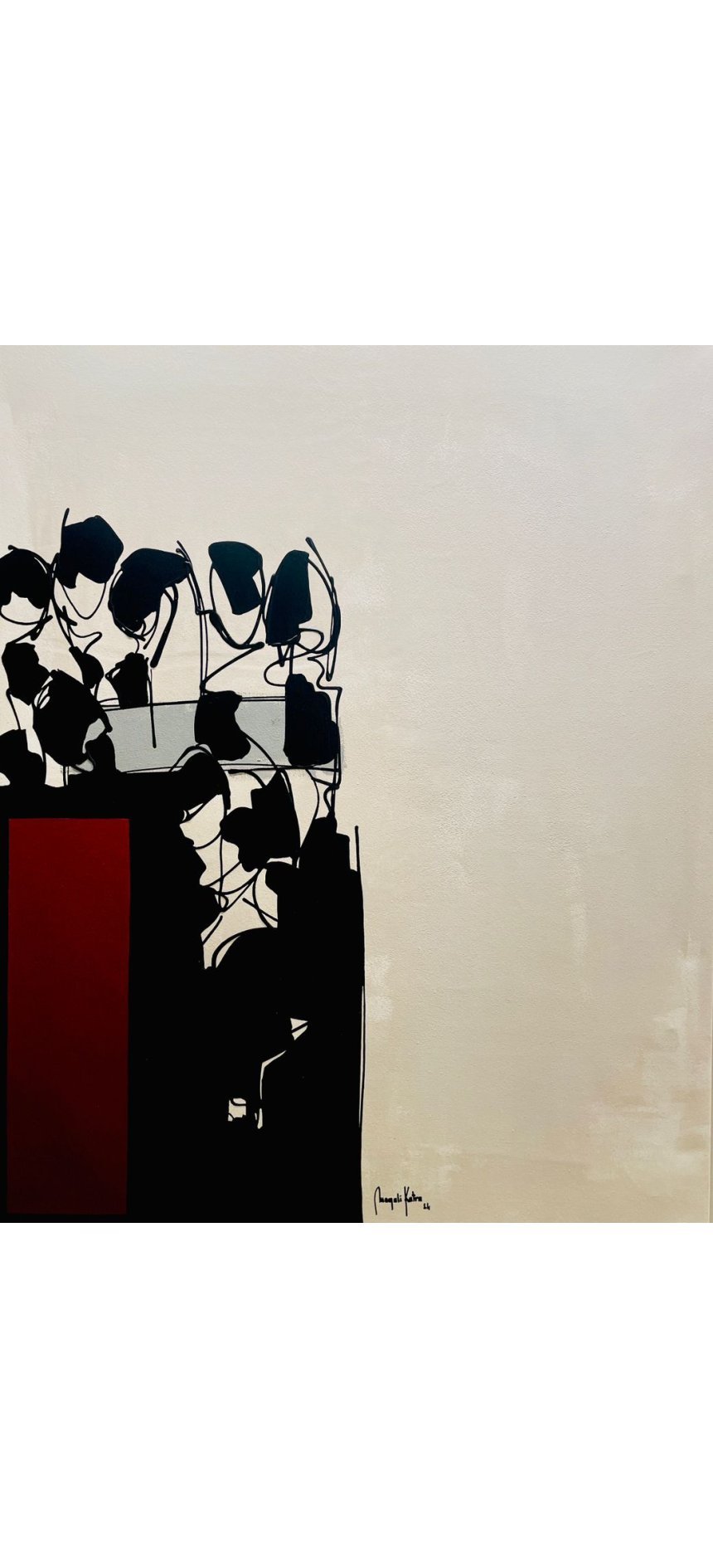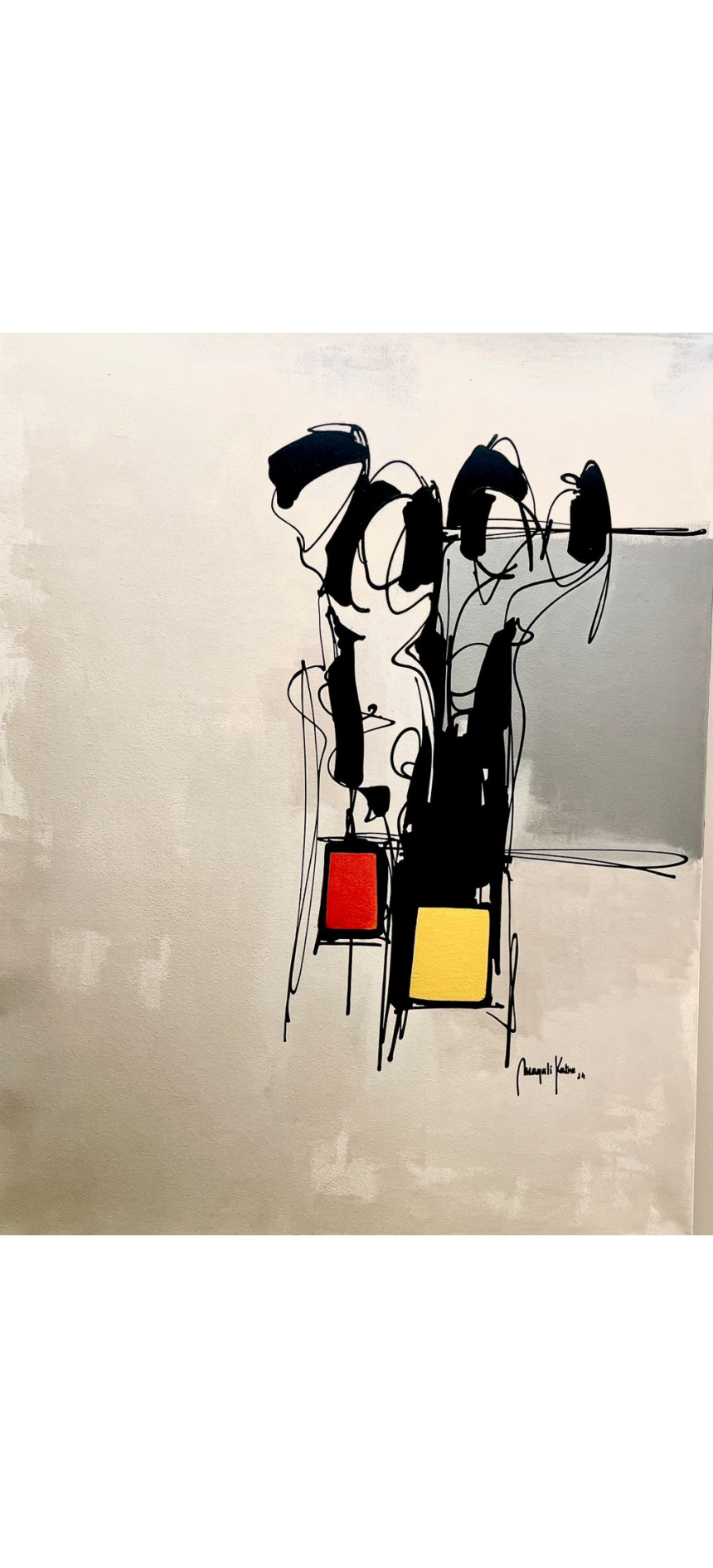 Également sur ses toiles, se manifestent des espaces blancs qui s’imposent comme des passages de vie. Les formes composées avec esthétique sont les expériences quotidiennes, et les silhouettes peintes avec tant de précision sont les individus qui se meuvent dans cette société.