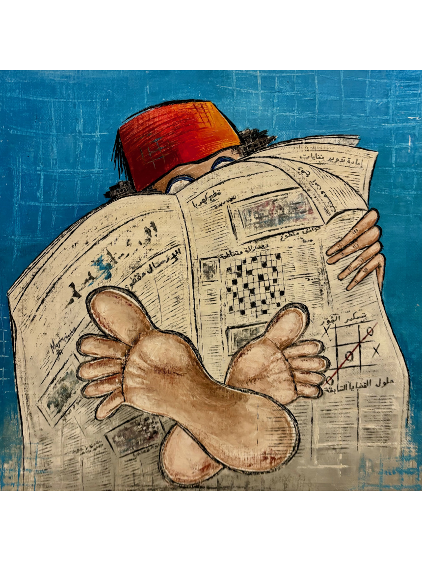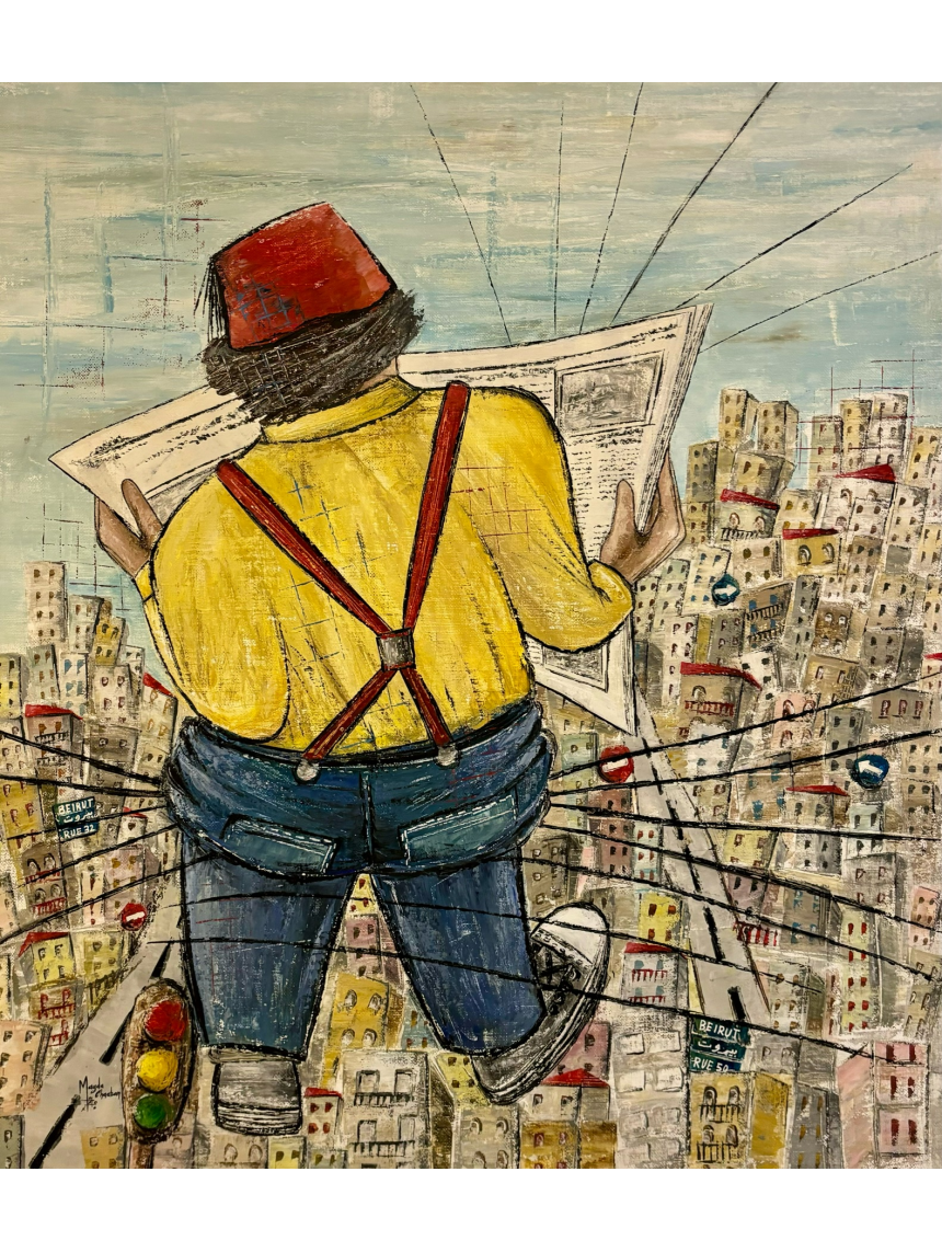 Les personnages se trouvent parfois au milieu d'un paysage urbain, où les fils électriques se font branches d'arbres pour oiseaux, au milieu d'une ville surpeuplée. On voit ces figures en pleine action, tantôt photographiant la vue, tantôt en pleine lecture du journal, avec un tarbouche sur le crâne.