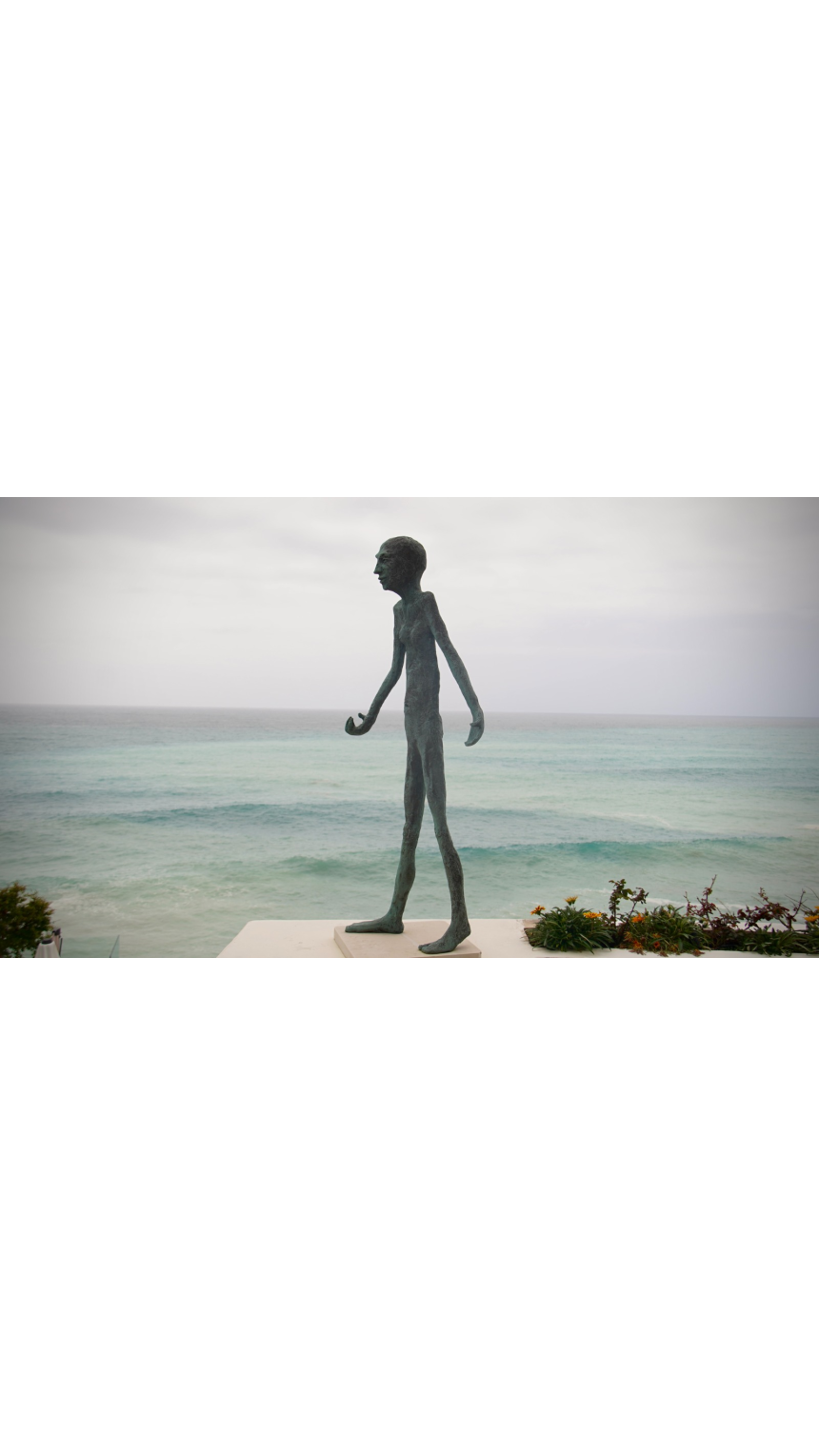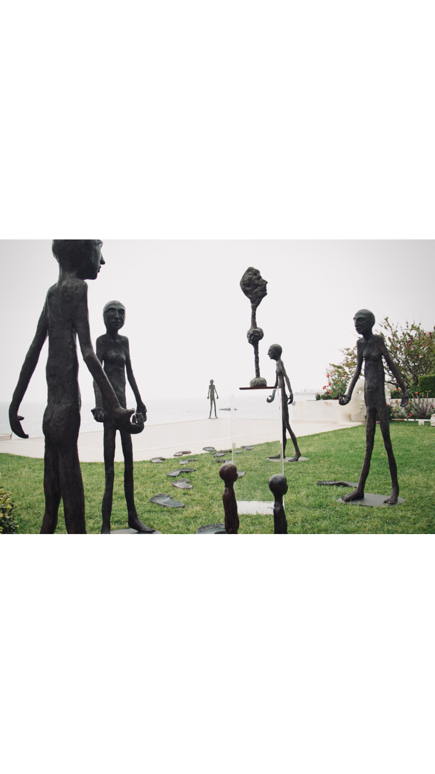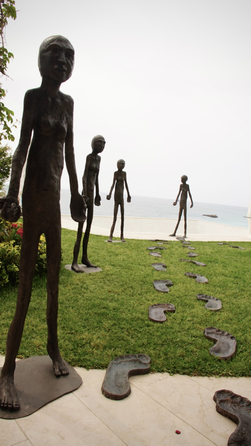 Dès l’entrée, une sculpture en bronze nommée Caminante accueille les visiteurs, entourée de six répliques en résine représentant des pas géants. Cette mise en scène symbolise avec éloquence la progression constante de l’individu à travers le monde, rappelant que le chemin se crée en marchant. Dans le jardin, trois statues en bronze interpellent par leur symbolisme puissant: l’une, assise sur un banc avec une valise ouverte, incarne l’installation permanente dans un pays, tandis que La Fille aux ballons représente le rêve et la légèreté, et La Fille au masque évoque la dualité de notre identité.