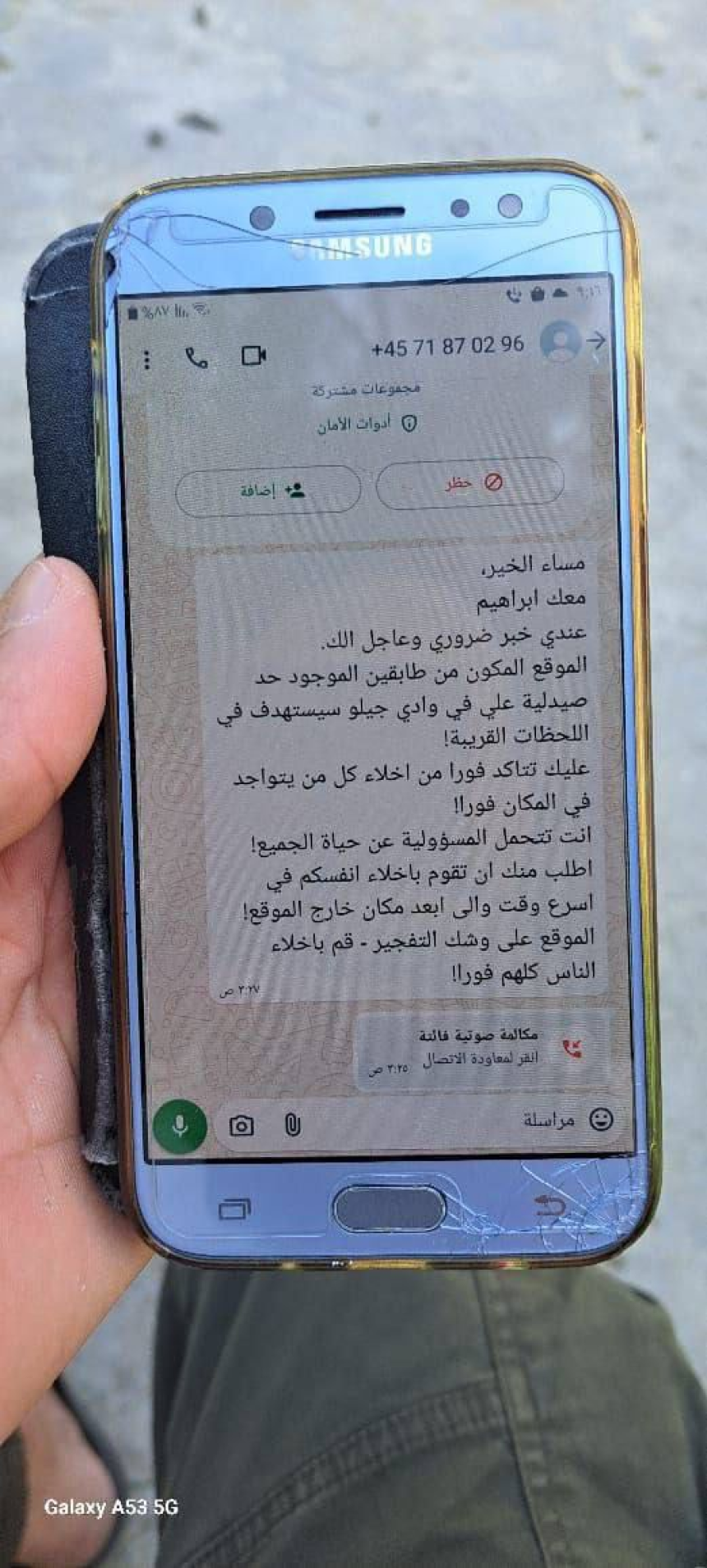 Un raid israélien a également ciblé, à l’aube de jeudi, une maison inhabitée à Wadi Jilo (caza de Tyr), occasionnant d’importants dégâts, ainsi que des incendies dans les habitations avoisinantes. Selon des informations qui circulent sur les réseaux sociaux, le propriétaire des lieux aurait été averti, par WhatsApp, d’une attaque israélienne imminente contre sa demeure. La source du message n’est pas précisée. Le numéro affiché montre l’indicatif téléphonique du Danemark.