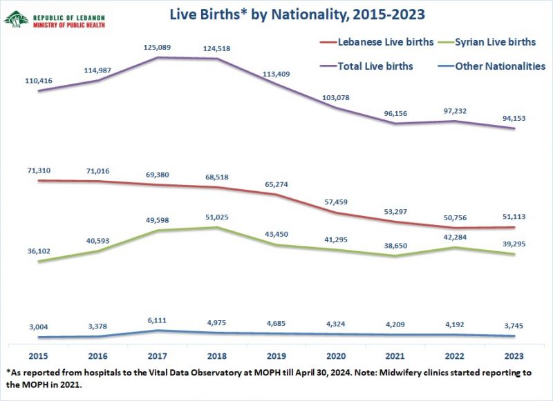Selon Mohammad Chamseddine, spécialiste en politique et recherche à Information International, le nombre de naissances libanaises était de l'ordre de 66.866 en 2023, contre 97.064 en 2018. En 2022, le taux de croissance annuelle de la population libanaise était de 1,9%, selon les chiffres de la Banque mondiale.