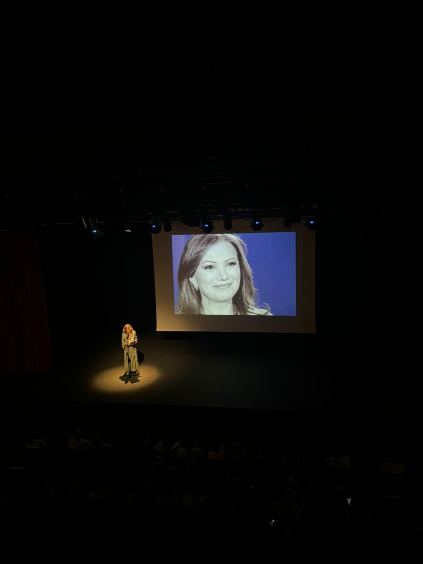 Dès l’entrée, les invités ont été accueillis par une sélection de photos de Gisèle ornant le foyer du théâtre, capturant des moments clés de sa vie personnelle et professionnelle. Des extraits de ses interviews et de son travail étaient diffusés en boucle sur deux écrans, permettant au public de se plonger dans son univers et de mieux comprendre sa personnalité et ses combats. Dans la salle, un grand portrait de Gisèle trônait, symbole de sa présence encore vive dans les mémoires. Devant cette image, la directrice du festival, Randa Asmar, a rendu un hommage poignant à la vie et à l’œuvre de Gisèle Khoury, soulignant son impact durable sur le paysage médiatique et culturel libanais.