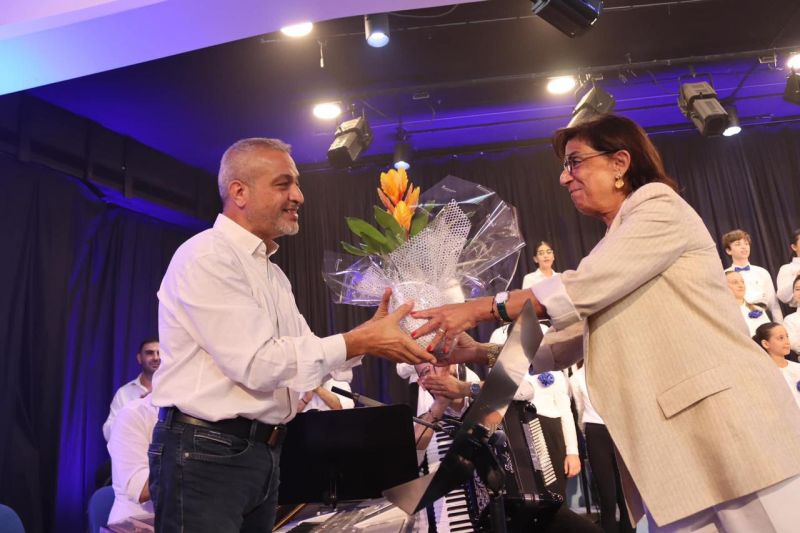 Elie Barrak recevant un bouquet de fleurs de Soha Choueiri, directrice de l’école Zahrat el-IhsanHommage sincère