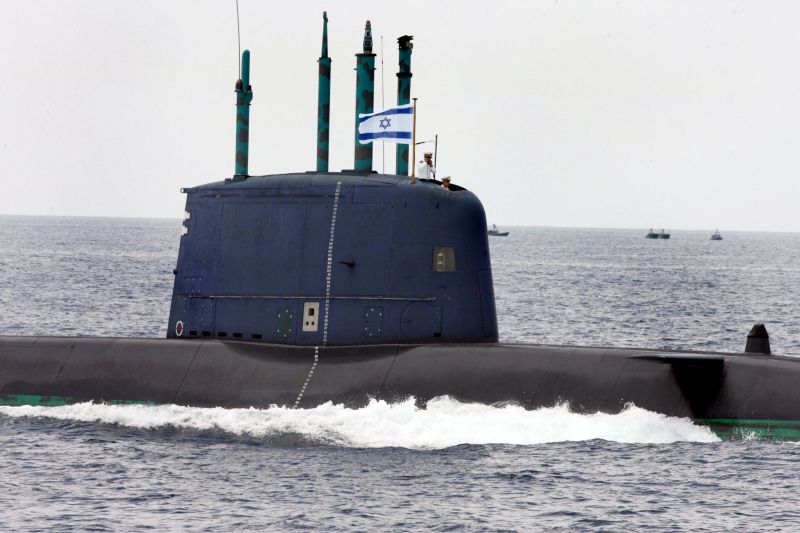 Le sous-marin israélien "Dolphin" navigue en Méditerranée près de la ville côtière de Tel Aviv lors de manœuvres navales spéciales à l'occasion du 60e anniversaire de l'indépendance d'Israël, le 5 mai 2008. Le "Dolphin", un sous-marin construit en Allemagne, mesure 56,4 m de long et a un rayon d'action de 4 500 milles nautiques. Il est armé de dix tubes polyvalents de 21 pouces pour les torpilles, les mines, les missiles et les leurres. (GALI TIBBON / AFP)