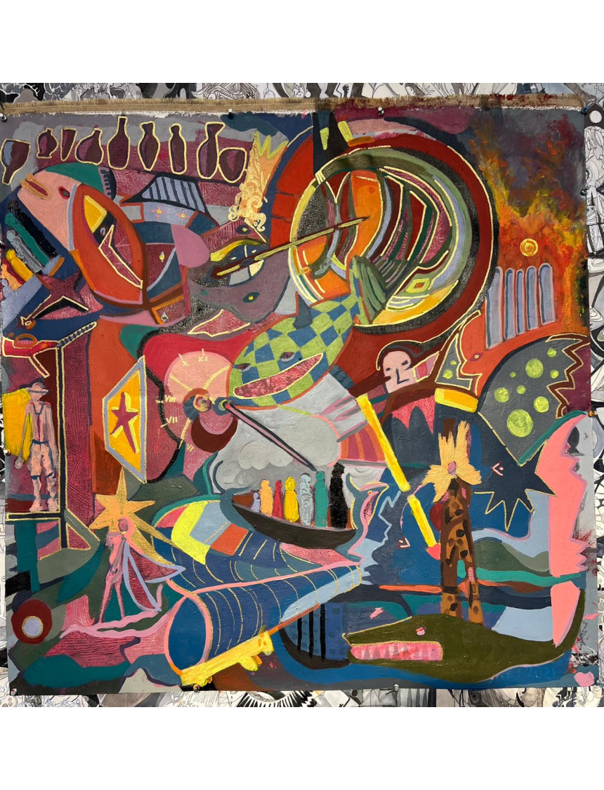 Sari el-Khazen, architecte, designer d’intérieur, artiste, animateur de télévision et professeur universitaire libanais, s’est fait connaître en concevant le Skybar à Beyrouth, ce qui lui a valu une reconnaissance internationale et de nombreux prix. Malgré son succès dans la redéfinition des intérieurs commerciaux au Liban et ses projets internationaux au Qatar, au Ghana, en Égypte et à Abu Dhabi, Sari exprime ses tourments intérieurs à travers son art. Ses peintures explorent des thèmes profonds tels que le sexe, la religion et la liberté, combinant précision architecturale et expression artistique pour révéler la complexité de l’âme humaine.