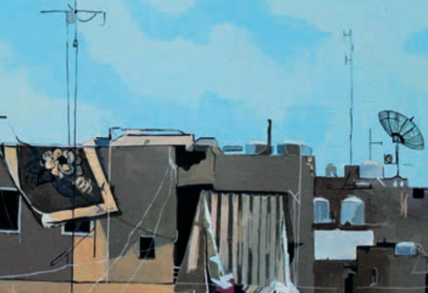 C’est à Bourj Hammoud, son quartier d’adoption, que Maral Der Boghossian trouve son inspiration au quotidien. En immortalisant sur la toile les façades de ce voisinage où ses ancêtres ont posé leurs valises il y a plus de 80 ans, fuyant le génocide, elle dessine les contours de son havre intérieur. Un processus créatif qui s’amorce dans ses carnets de croquis, peuplés d’esquisses de vues urbaines saisies sur le vif lors de ses déambulations, et qu’elle capture aussi parfois par l’objectif de son appareil photo. Autant de jalons qui nourrissent ensuite son travail en atelier, où elle recompose ces fragments de réel en tableaux vibrants de sincérité.
